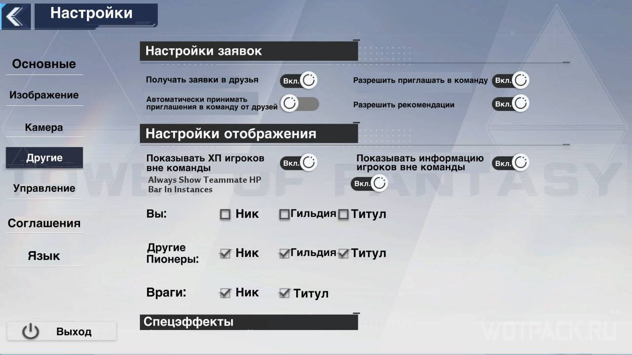 - Настройки отображения – показывать ХП других игроков вне команды, информацию о них, а также отображение ника, гильдии и титула у себя, других пионеров и врагов.