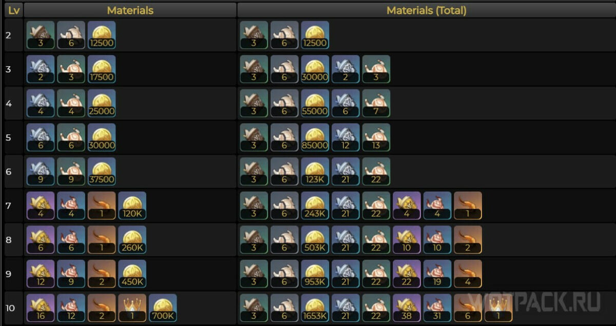Далее разберем, какие материалы необходимы для возвышения до максимального уровня, а также для прокачки ее талантов.