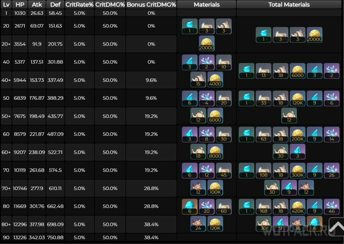 | Уровень | Базовое HP | Базовая атака | Базовая защита | Бонус Крит.урона |