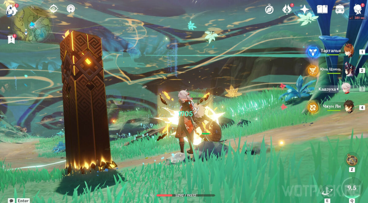 - Используйте навыки и атаки остальной команды, нанося урон. Когда закончится действие баффа Кадзухи или снова потребуется стяжка, начинайте с пункта 1. Если на враге останется статус нужного элемента, то можете продолжать с пункта 2.