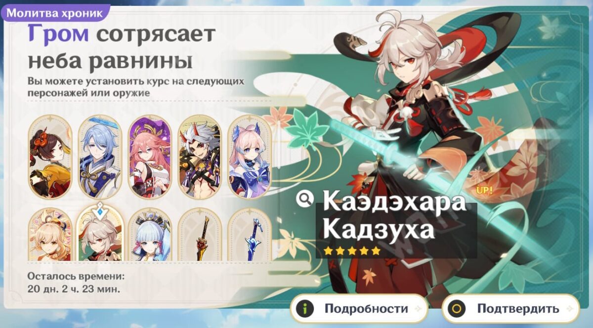 Последний выить Кадзуху можно было в Молитве хроник Инадзумы, во второй фазе обновления 5.6, с 27 мая по 17 июня 2025 года. Созвездия открываются при получении копий персонажа.
