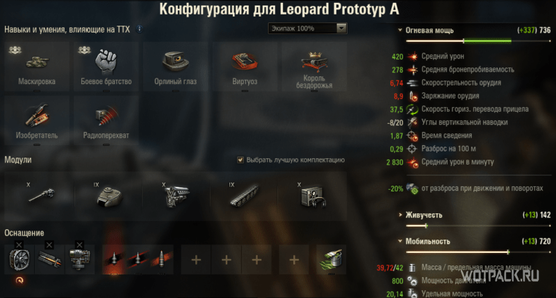 Оптимальным вариантом будет поставить приспособления, влияющие на урон в минуту и комфортность ведения огня, для снайперских выстрелов потребуется заезжать на возвышенности и быстро стрелять, пока противник в засвете. Чтобы достичь показателей среднего урона в 2830 единицы, стоит использовать такое оборудование: