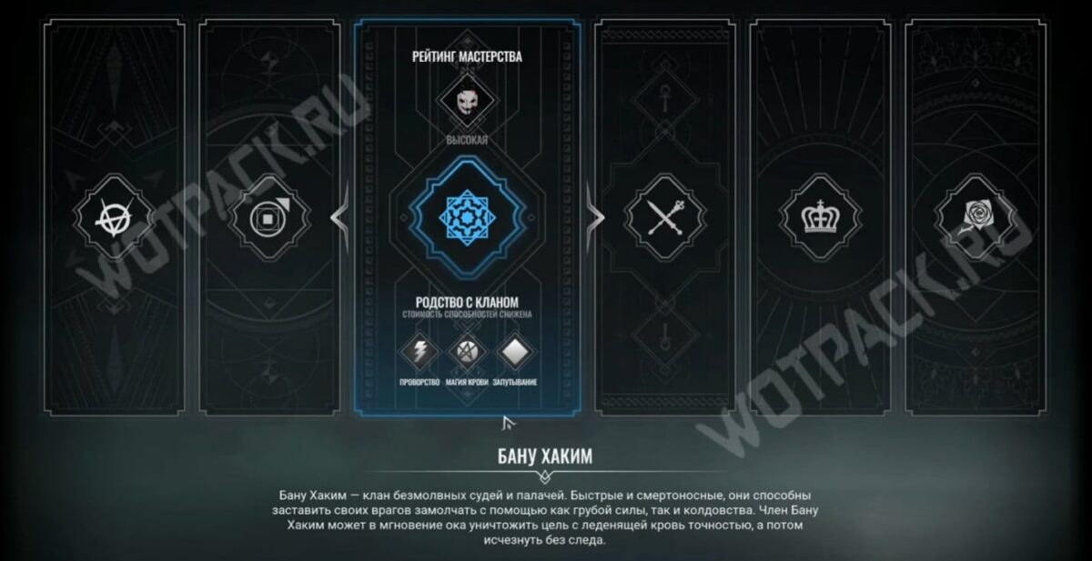 Истоки линии крови протагониста прежде всего сказываются на скиллсете: начальная пассивная способность привязана к выбранному семейству и не может быть заменена на умение иного клана. Обычные способности можно открывать без привязки к группировке, но они стоят в два раза дороже. Перк в верхней части дерева аналогичным образом можно изучить, даже не принадлежа к семейству.