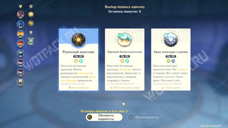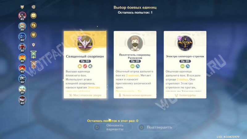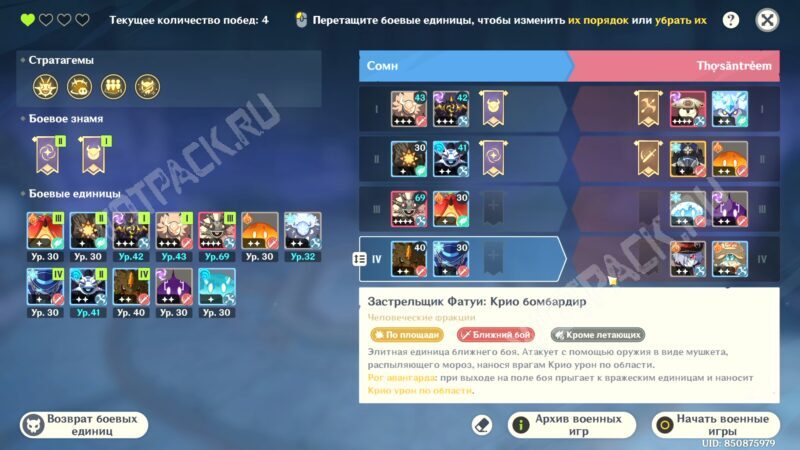 В начале каждого боя даётся определённое количество попыток, чтобы выбрать союзников, боевое знамя и стратагемы. Формируйте более мощные комбинации и уничтожайте противников до того, как они расправятся с собранным построением. Все выбранные компаньоны и баффы сохраняются до конца текущей серии военных игр.