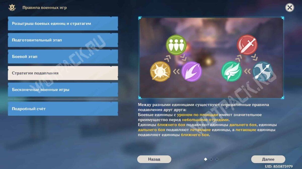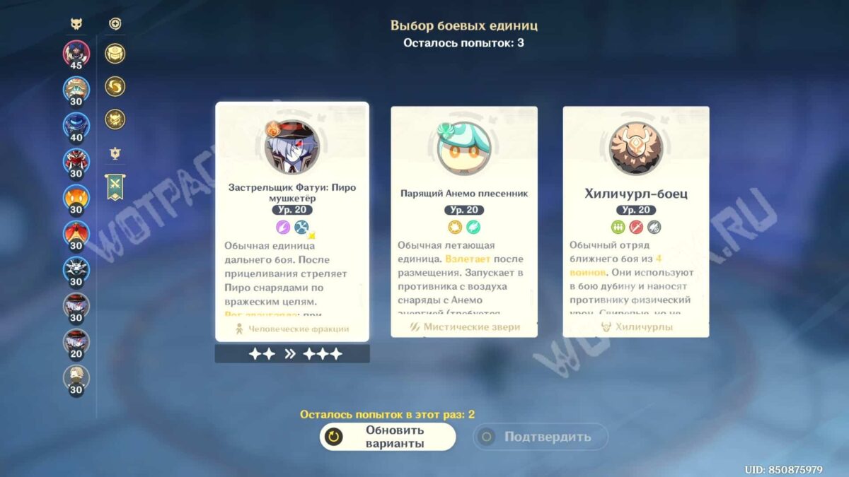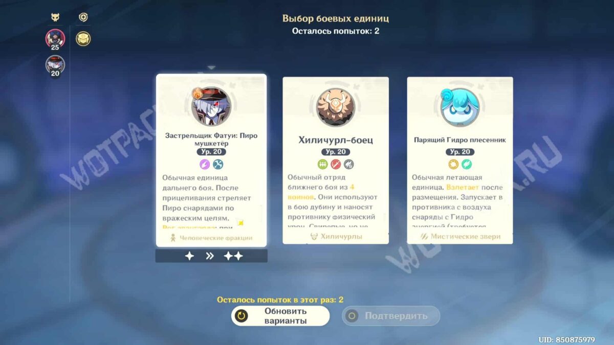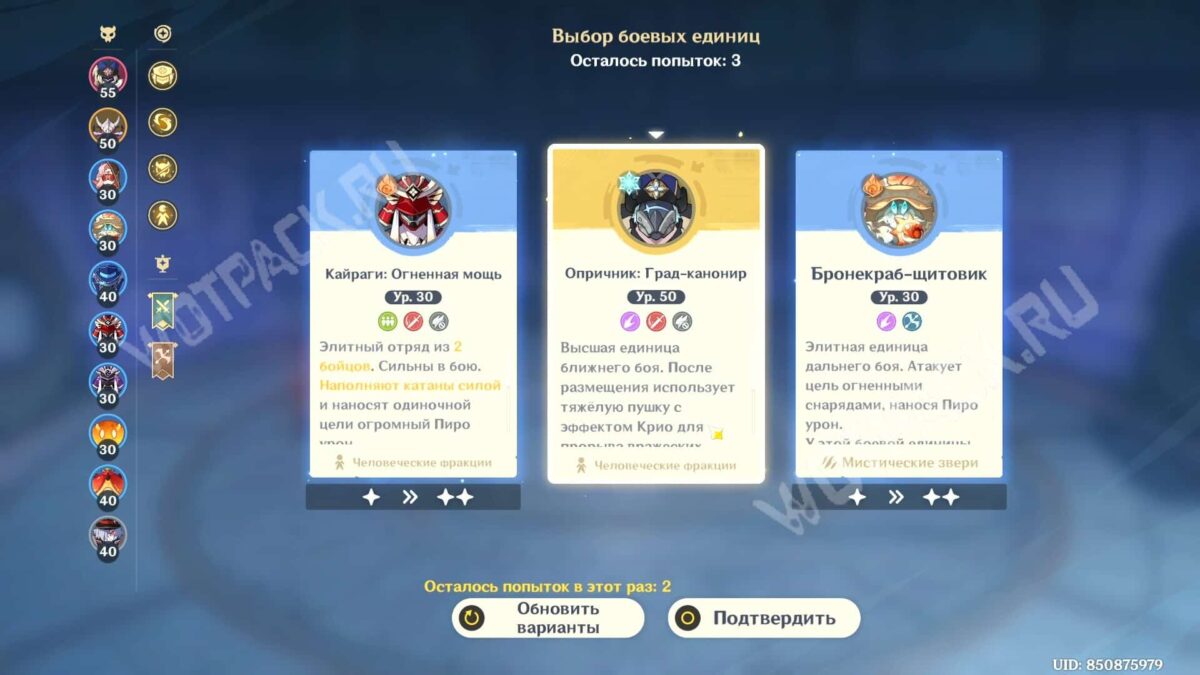 В начале каждого боя даётся определённое количество попыток, чтобы выбрать союзников, боевое знамя и стратагемы. Формируйте более мощные комбинации и уничтожайте противников до того, как они расправятся с собранным построением. Все выбранные компаньоны и баффы сохраняются до конца текущей серии военных игр.