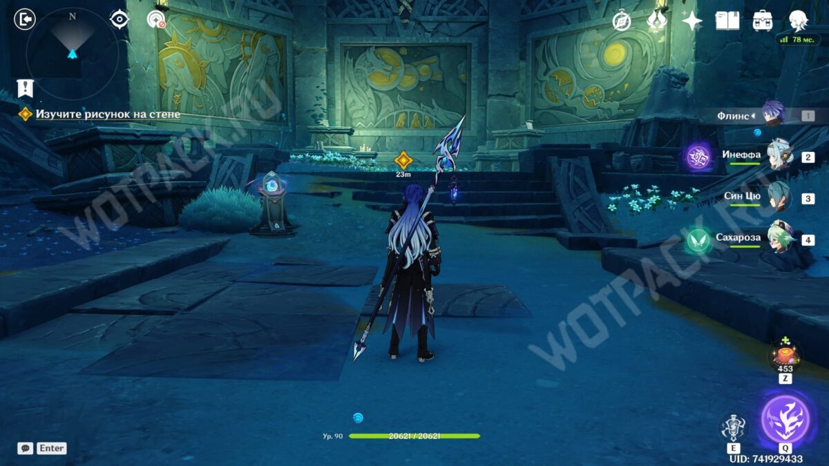 Войдите в зал с барельефами и одолейте две волны противников, состоящих из Гидро слаймов, мимиков и призраков. Изучите рисунок на стене вместе с Николь и другими.