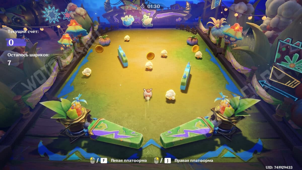 Развлечение немого ангела — аналог пинбола, в котором в роли шара выступает Додоко. Управляйте левой и правой платформой, отбивайте хвостатое существо и разрушайте различные цели на поле. Забег закончится, когда истратите все шарики или по истечении таймера.