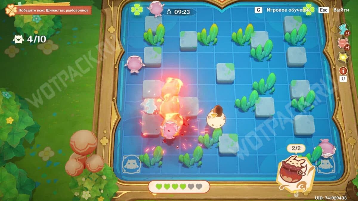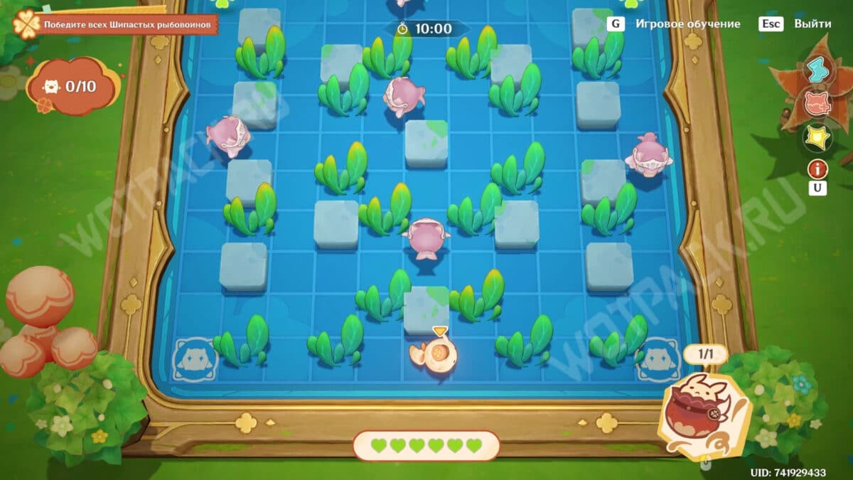 Игра мамы Кли — уже знакомое испытание, ранее не раз встречавшееся в игровых событиях. Управляя Додоко, передвигайтесь по полю и размещайте бомбы, чтобы устранять враждебных существ. Победите всех Шипастых рыбовоинов для успешного завершения вызова.