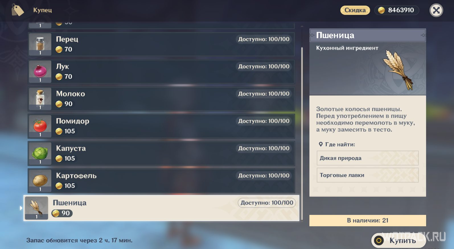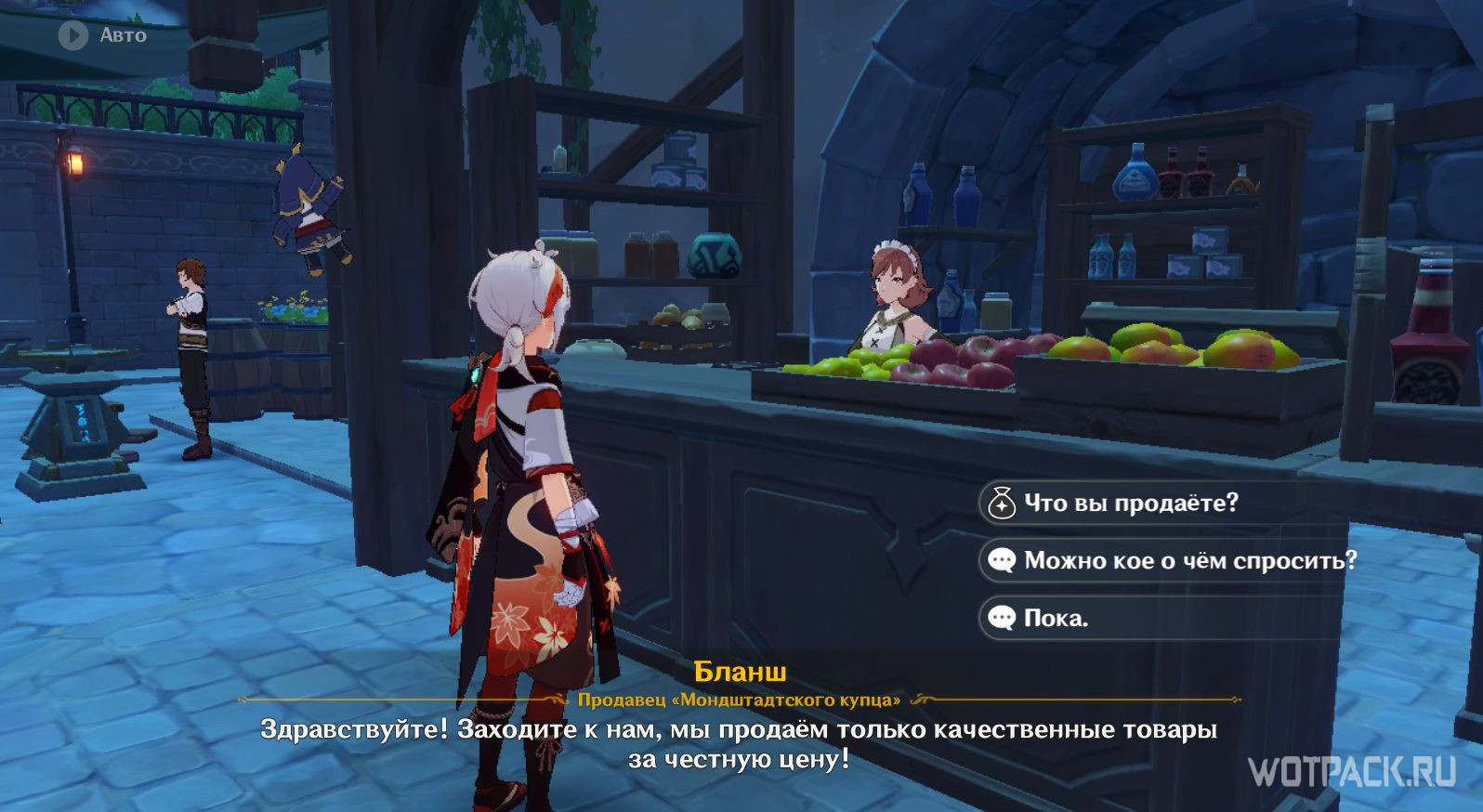 Начните диалог с продавцом «Мондштадтского купца» и выберите вариант ответа «Что вы продаете?». Откроется весь ассортимент.