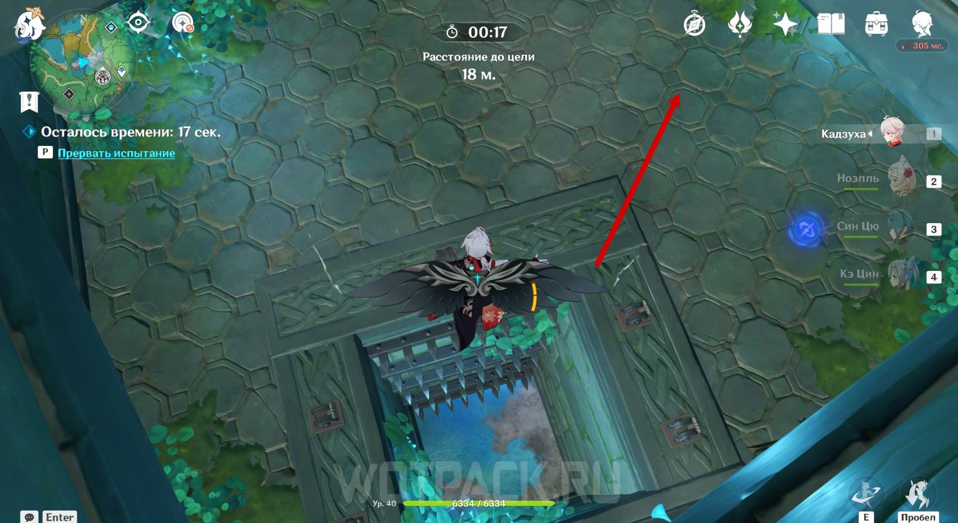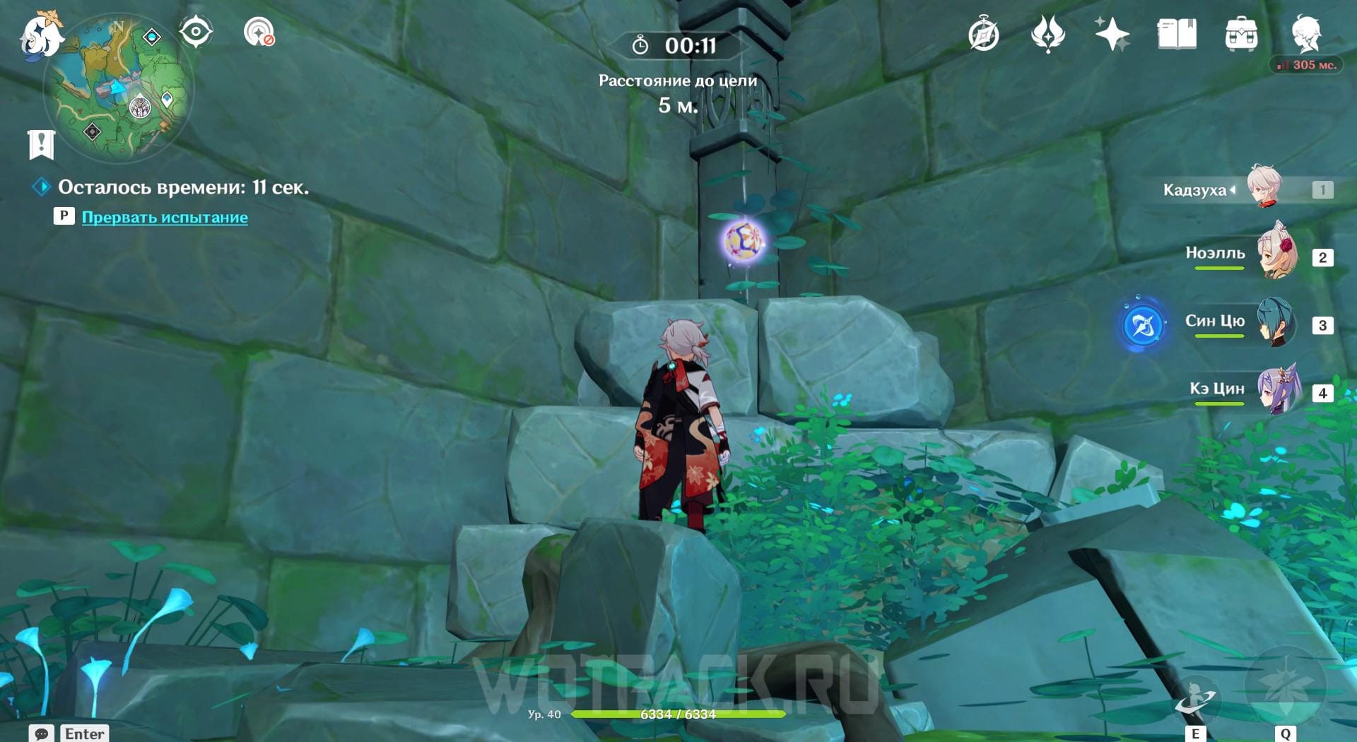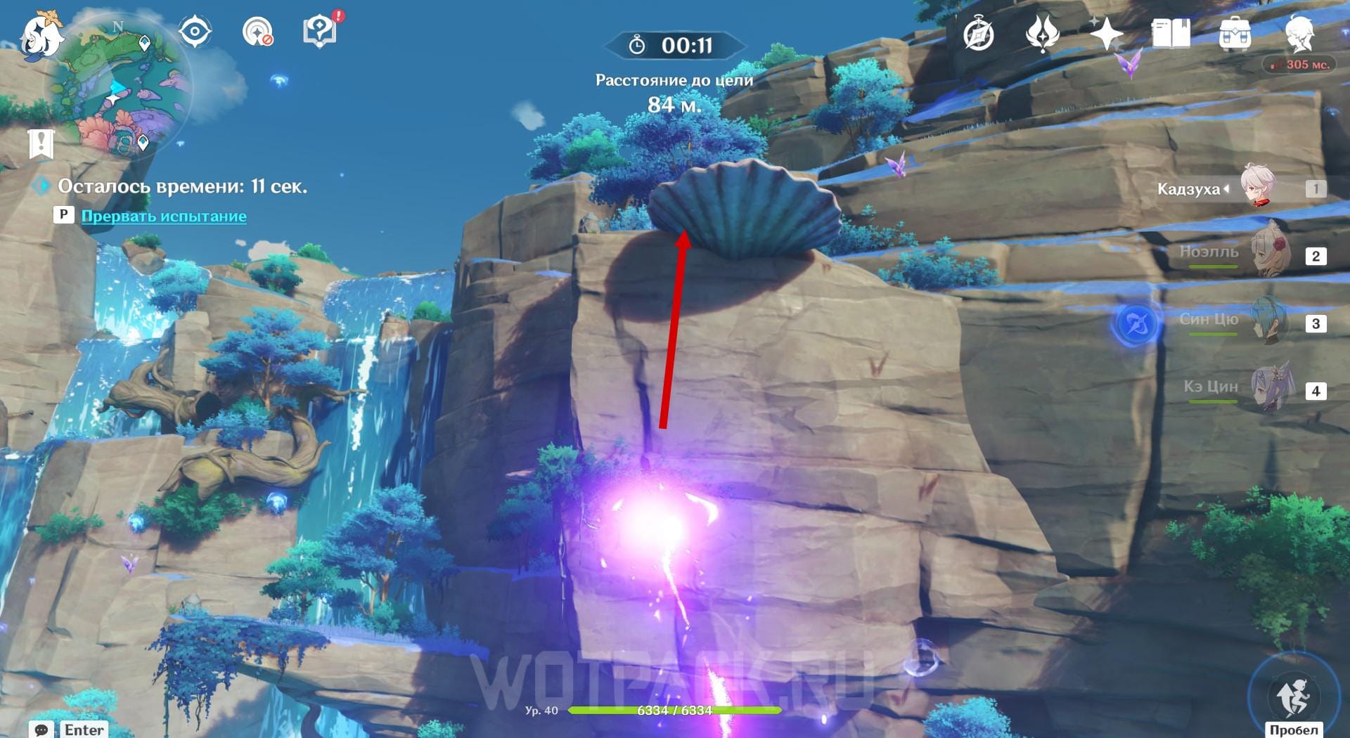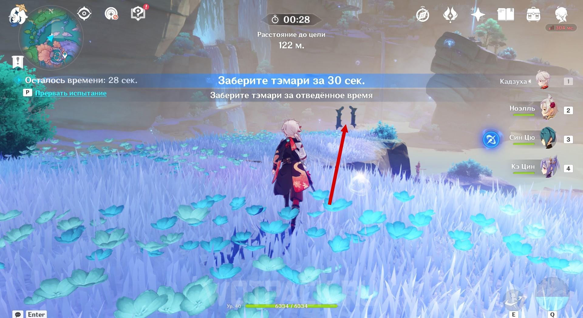 Сложность последнего испытания заключается в том, что за отведенные 30 секунд добраться до нужного места достаточно проблематично. Поэтому постарайтесь взять в отряд персонажей, чьи способности помогут забираться на высокие точки. Например, хорошо подойдут Кадзуха, Венти, Странник, Чжун Ли, аль-Хайтам, Кэ Цин.