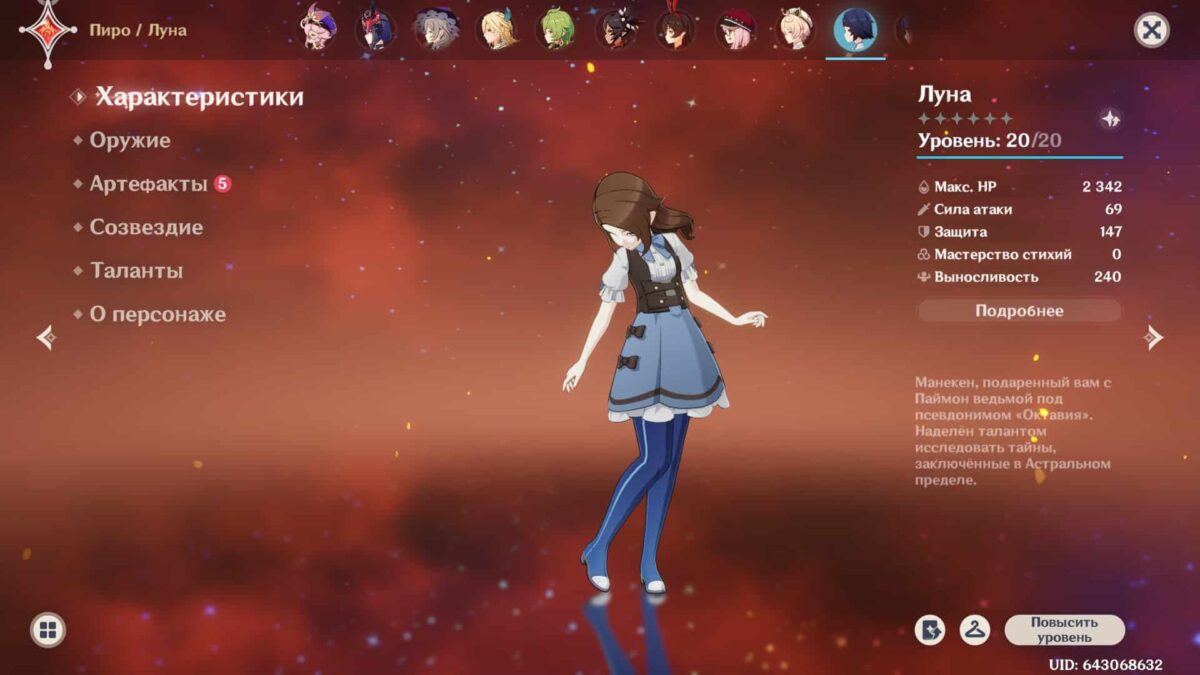 Ключевой стат – это процент силы атаки. Помимо него, при прокачке растёт также базовая АТК, защита и HP союзника. Поскольку Манекен выполняет скорее декоративную функцию и не участвует в высокоранговых активностях, вкладываться в его развитие до 90 уровня нет смысла, а для легкого закрытия контента в открытом мире хватит и 80.