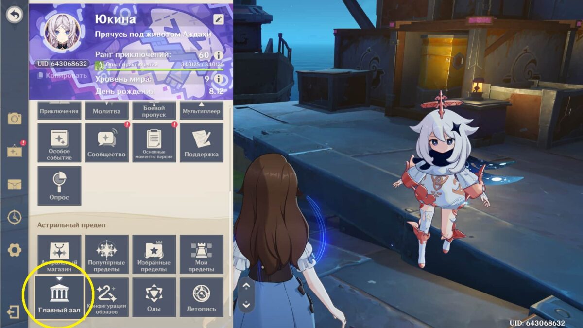 Для смены наряда в Астральном пределе есть отдельное меню кастомизации. Чтобы попасть в него, необходимо или переместиться в Главный зал, или воспользоваться меню Паймон, ткнув на иконку с вешалкой.