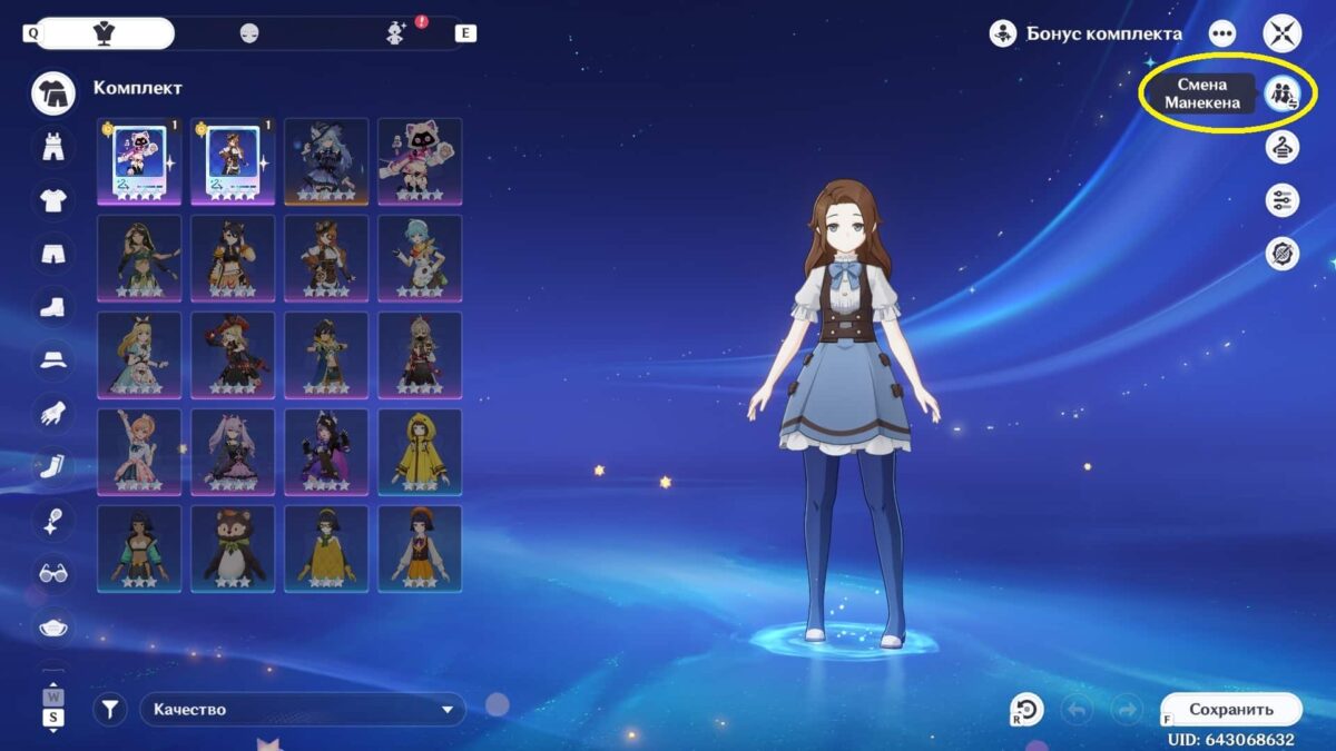 Там можно создать уникальный образ для своего Манекена, используя имеющиеся комплекты одежды и их расцветки. Допускается комбинирование отдельных частей между собой и свободное размещение деталей на модели. Все собранные облики можно сохранять в пресетах, в которые перевоплощается Манекен после использования своих навыков в Тейвате.