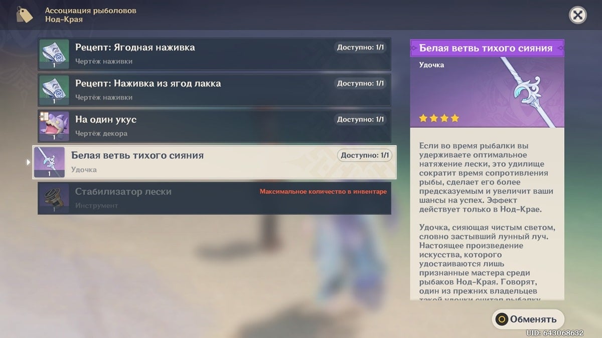 За два рецепта наживки она попросит шесть обычных Оризий, а вот за особые предметы придётся много побегать по рыбным местам Лунного региона. Также у торговца удастся приобрести удочку «Белая ветвь тихого сияния», которая позволит сократить время сопротивления рыбы и ускорить её поимку.