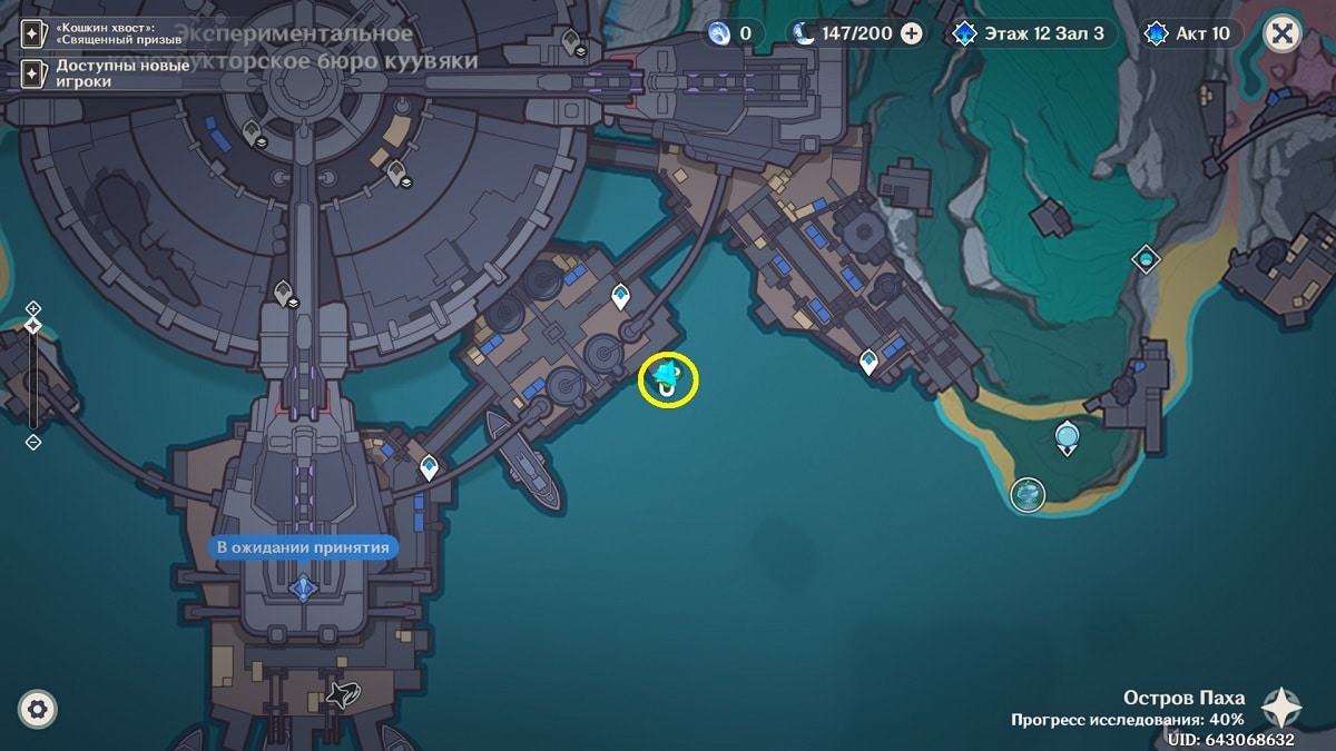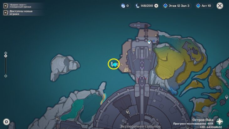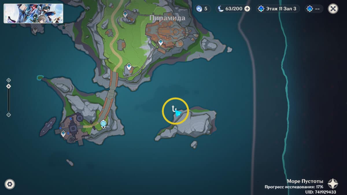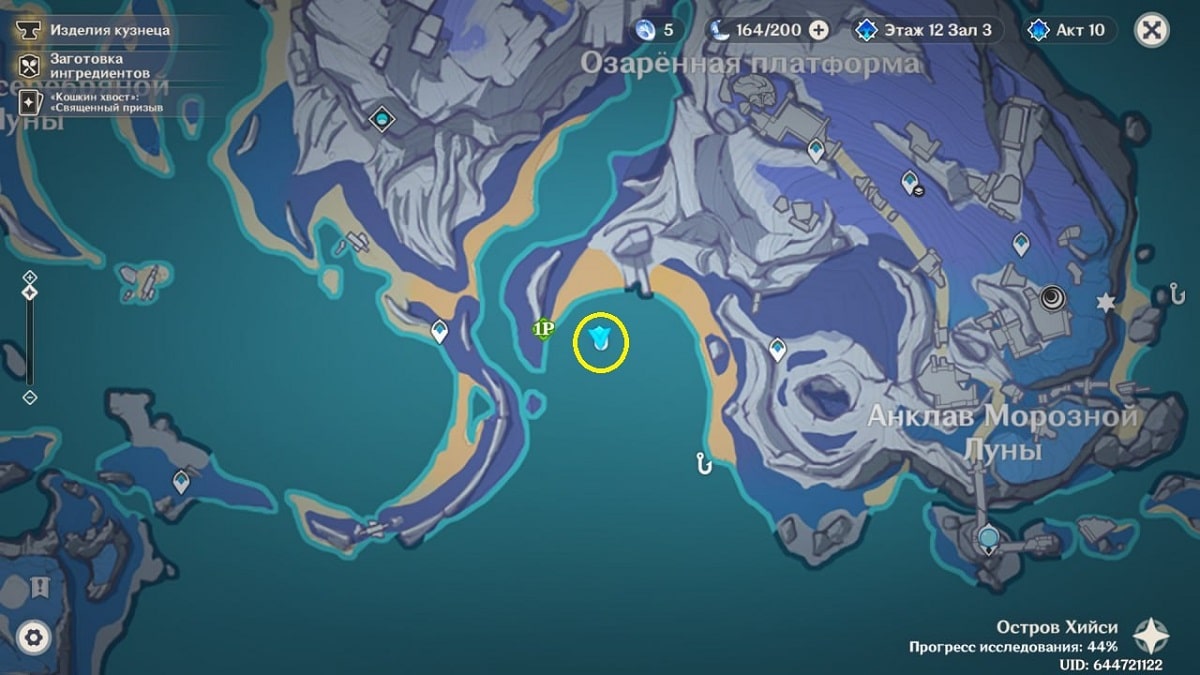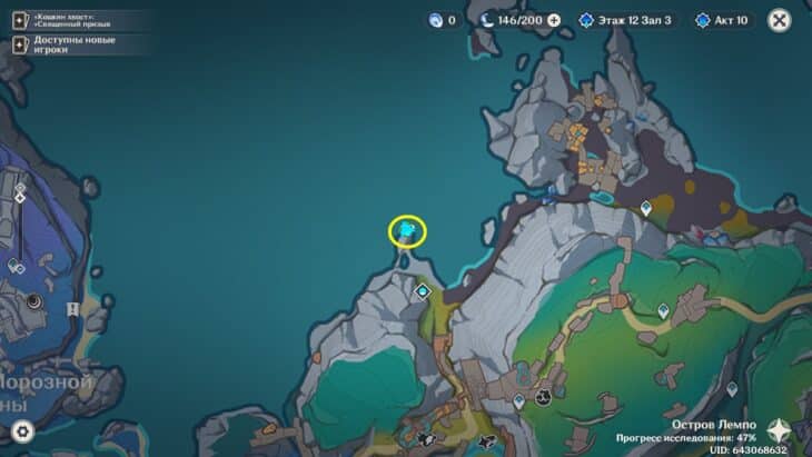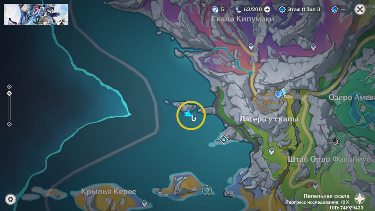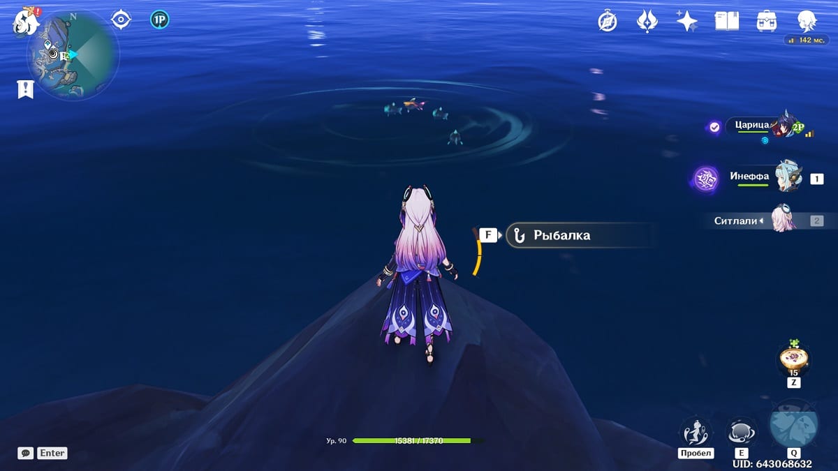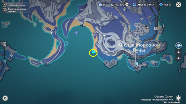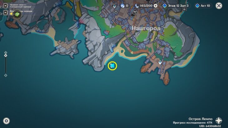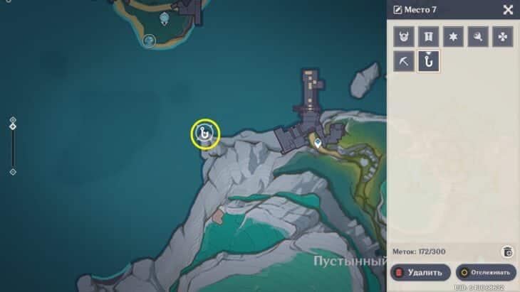 Рыболовная зона в центре залива, чуть дальше от берега. Для открытия этой точки необходимо пройти задание мира Добыча Миража. После завершения квеста ловля будет доступна.
