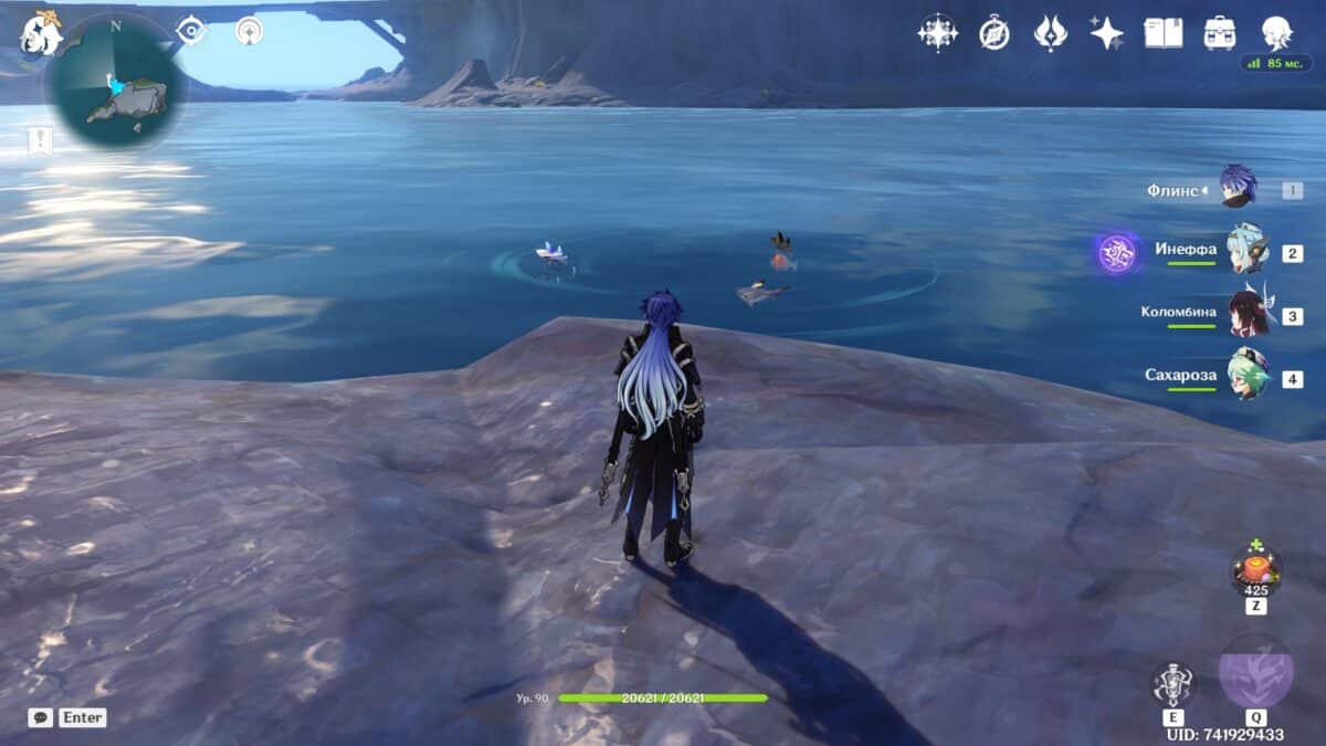 Скопление морских рыб находится на утёсе с видом на базу Фатуи, Экспериментальное конструкторское бюро. Отправляйтесь к точке, расположенной в порту, и двигайтесь по кромке воды до выступа, с которого заметно характерное свечение.
