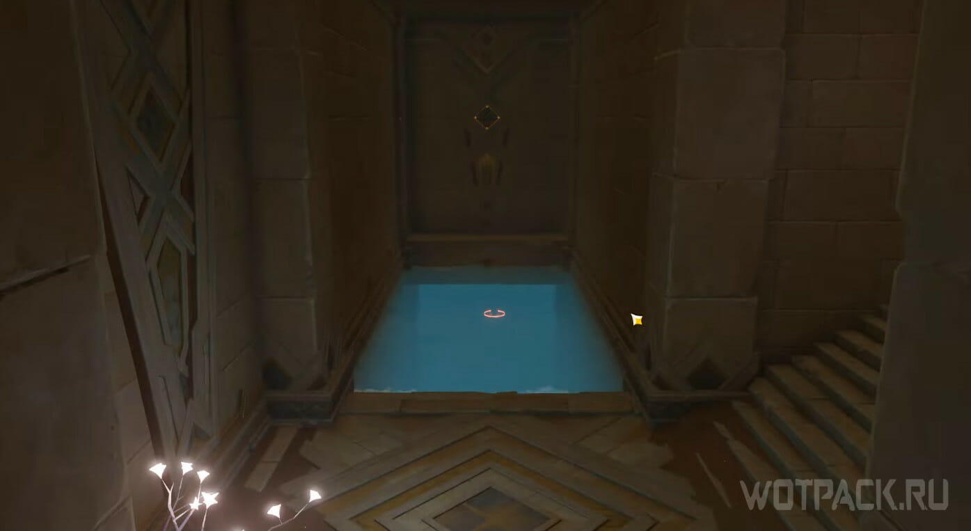 Приземлившись, разблокируйте Первозданную искру, расположенную прямо под отверстием, в которое падали. Проведите ее в коридор, залитый водой. Огонек активирует Первозданный факел, а также опустит уровень воды в зале.