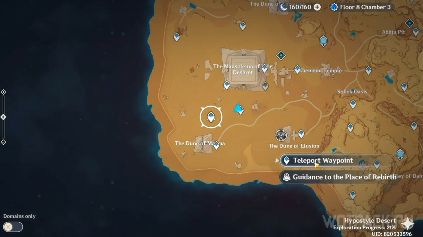 Чтобы попасть в Место перерождения, сначала переместитесь к телепорту, расположенному на севере от Дюны Магмы и на юге от гробницы царя Дешрета. Телепортировавшись, окажетесь под землей, рядом со входом в руины.