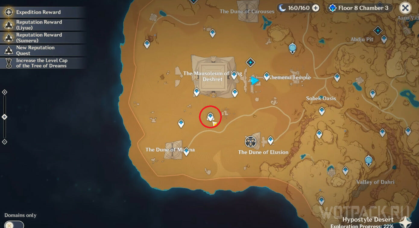 Для начала переместитесь к путевой точке, отмеченной на карте. Она находится на юге от гробницы царя Дешрета и на северо-востоке от Дюны Магмы и откроется по квесту Двойное доказательство. Зайдите в зал Дуат.