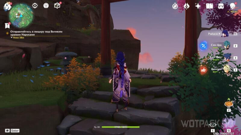 После того как Путешественника и Паймон выгонят из подсознания Эи, нужно идти к Яэ Мико. Она стоит у Священной сакуры (см. метку задания). Расскажите ей о происходящем. Спуститесь вместе ко входу в пространство Райдэн Макото (пещера под Великим храмом Наруками).