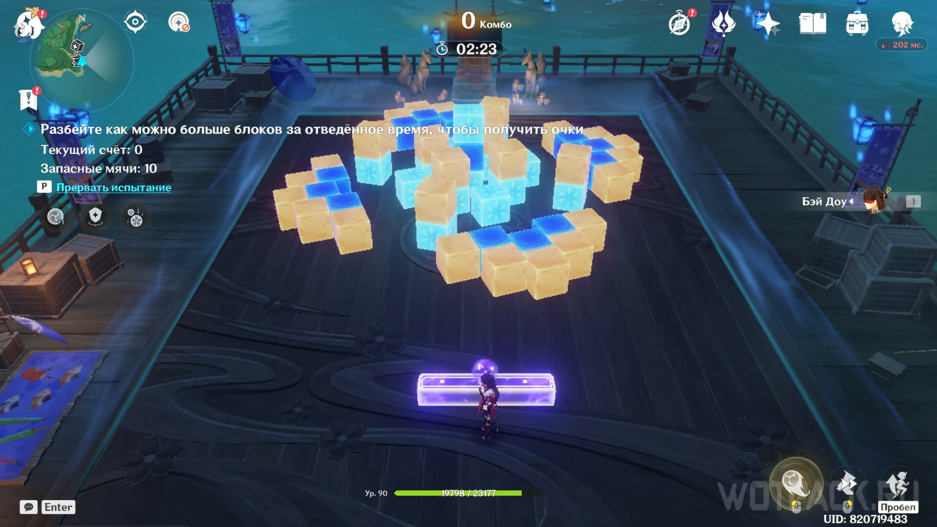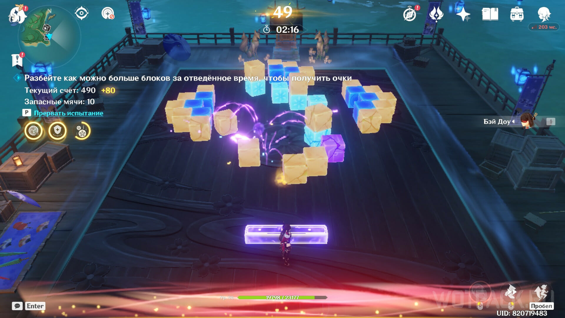 Второй этап испытания в режиме развлечения целиком состоит из Гидро и Крио блоков, что значительно облегчает прохождение. Воспользуйтесь Электро персонажем, чтобы запускать реакцию Высокого напряжения при взаимодействии с Гидро кубами. Такое взаимодействие разрушает не только тот блок, по которому ударил мяч, но и многие другие в небольшом радиусе.
