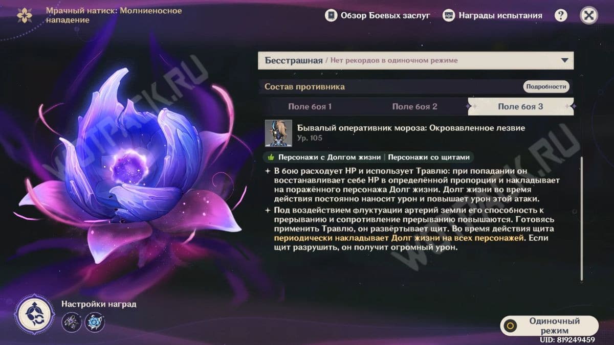 |  |  |   |  | Убить штурмовика можно и без ЛЗ при условии, если Райдэн достаточно прокачана и имеет созвездия. Вместе с Фишль она постоянно атакует врага обычными, вешая статус от Е Лань или Син Цю. Шилонен снижает резисты. |