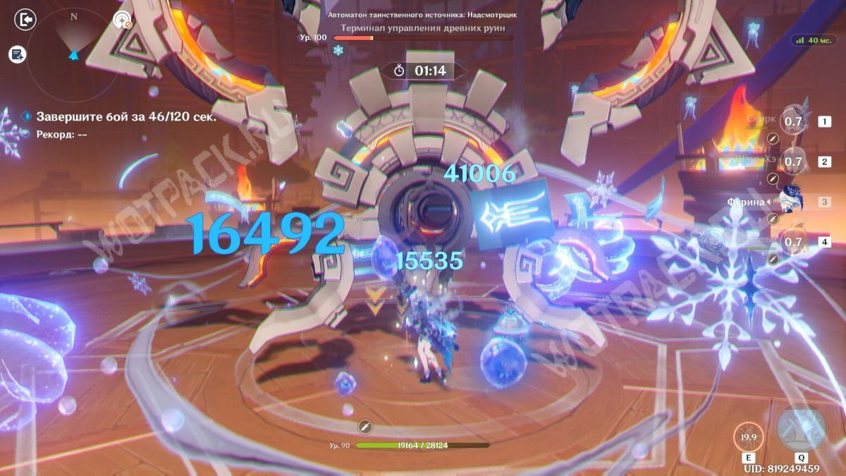 В третьей комнате предстоит сразиться с Автоматоном таинственного источника, который уязвим к Крио элементу. Атакуйте его ледяной стихией, чтобы не дать заполниться шкале, после чего босс Стремительный удар снизит резисты. На пятой сложности у него более высокое сопротивление, а шкала снимается труднее, чем на меньших уровнях.