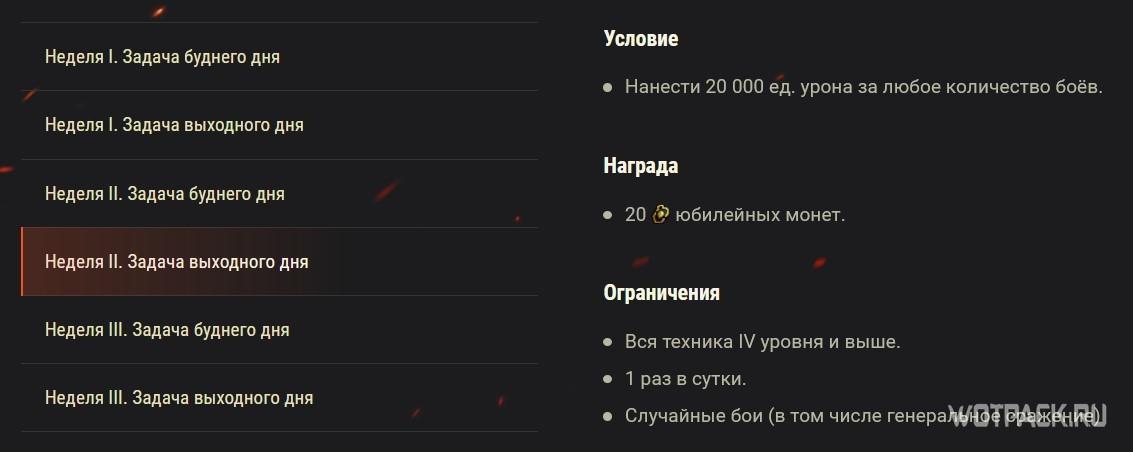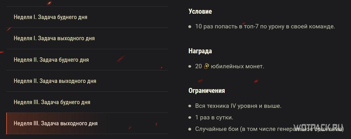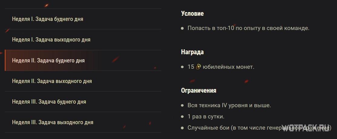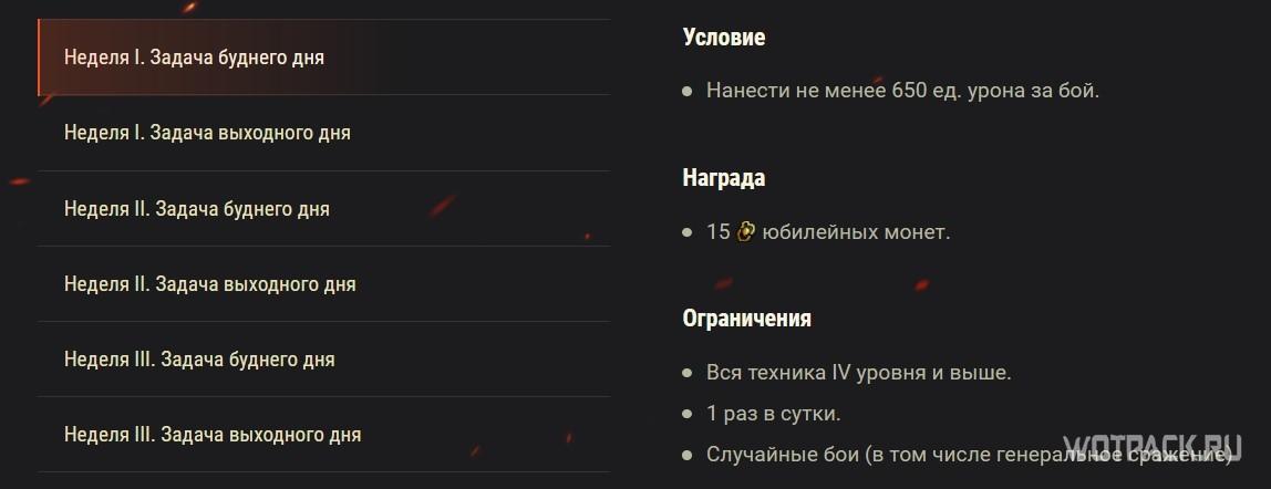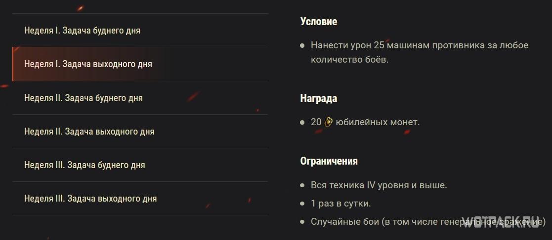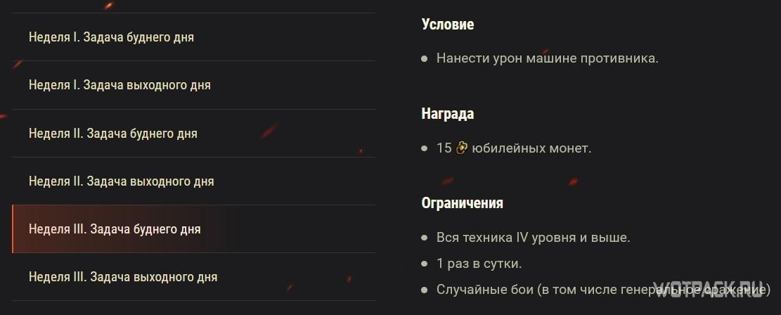 В случайных боях с понедельника по пятницу будут доступны для выполнения простенькие юбилейные задачи, а в субботу и воскресенье они станут сложнее, но и награды будут более ценными: