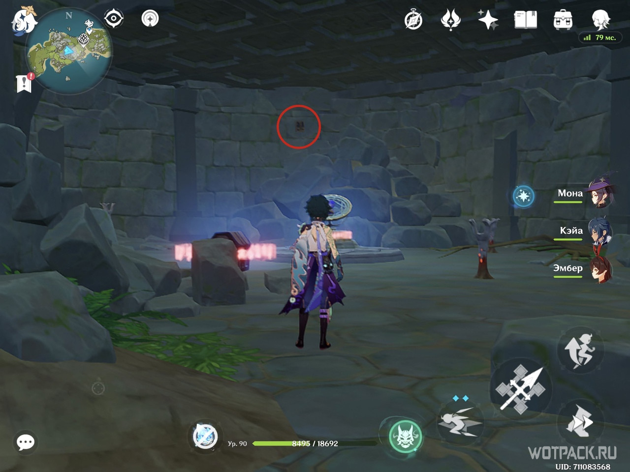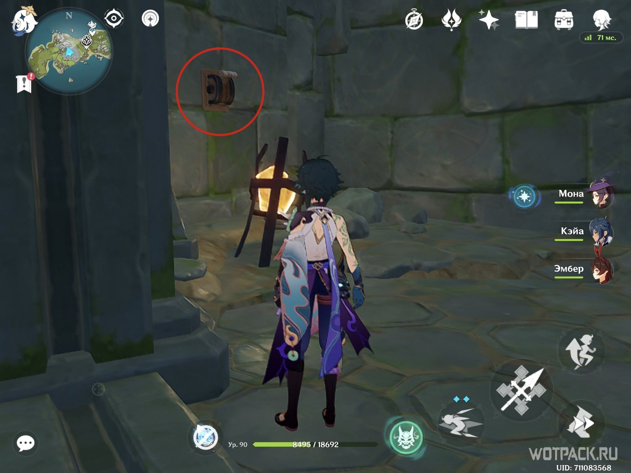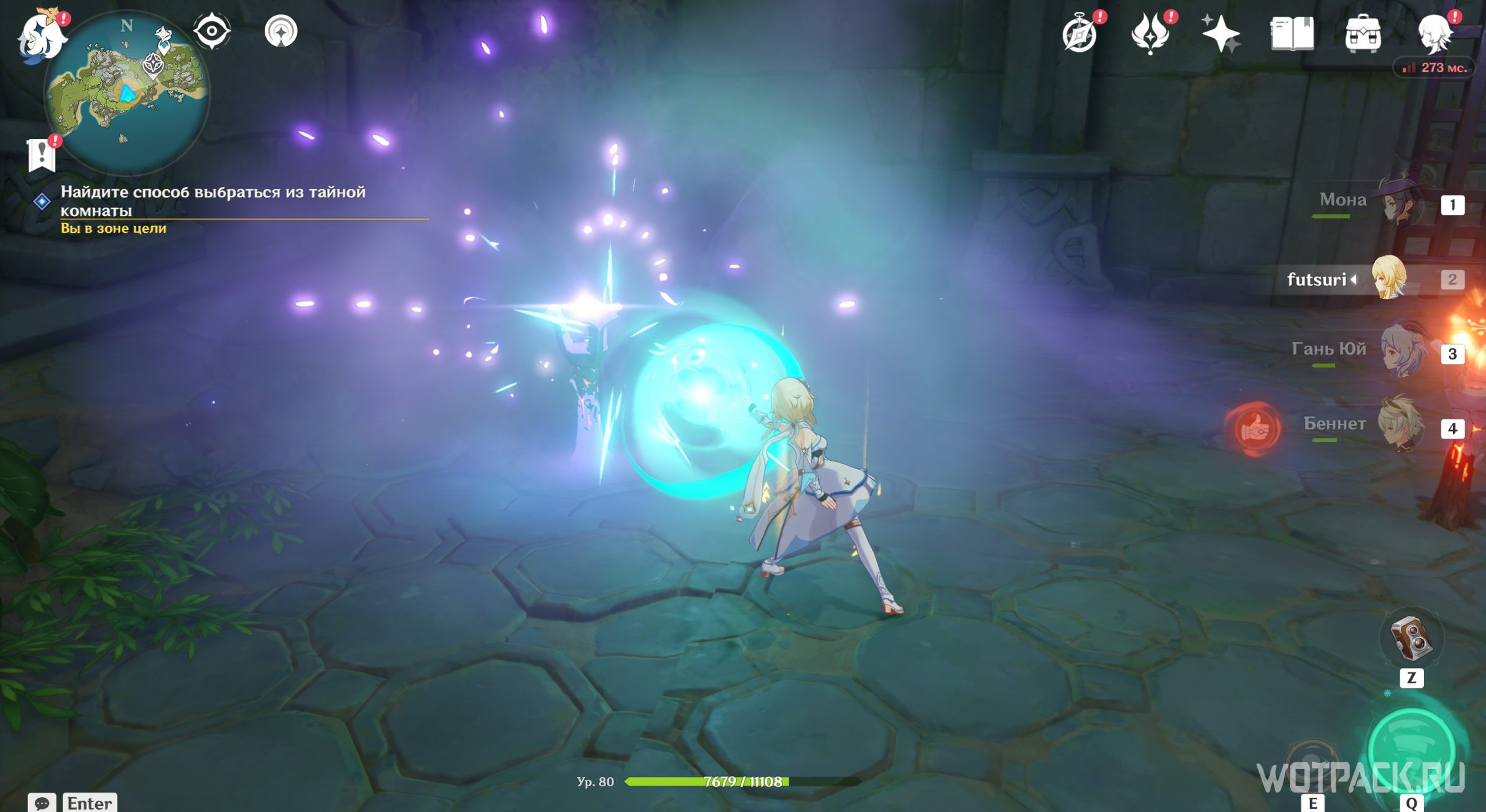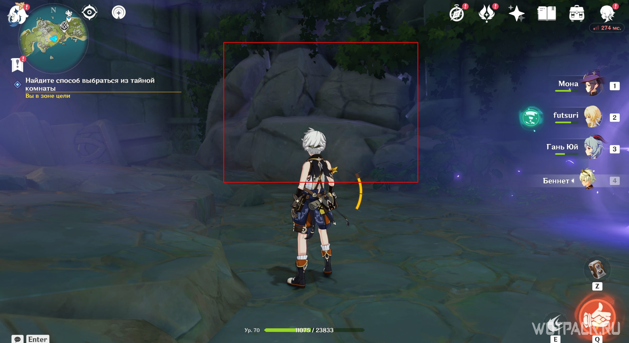 В дальнем правом углу тайной комнаты есть камни, которые можно и нужно уничтожить. Первая проблема устранена, теперь подойдите к каждому факелу и, пользуясь Анемо рассеиванием, очистите их от порчи.