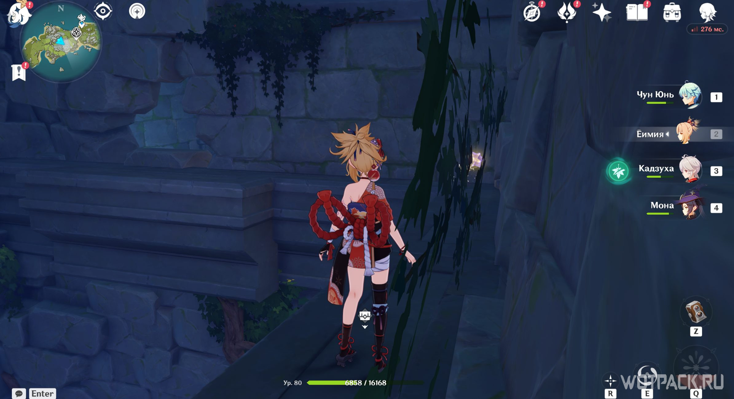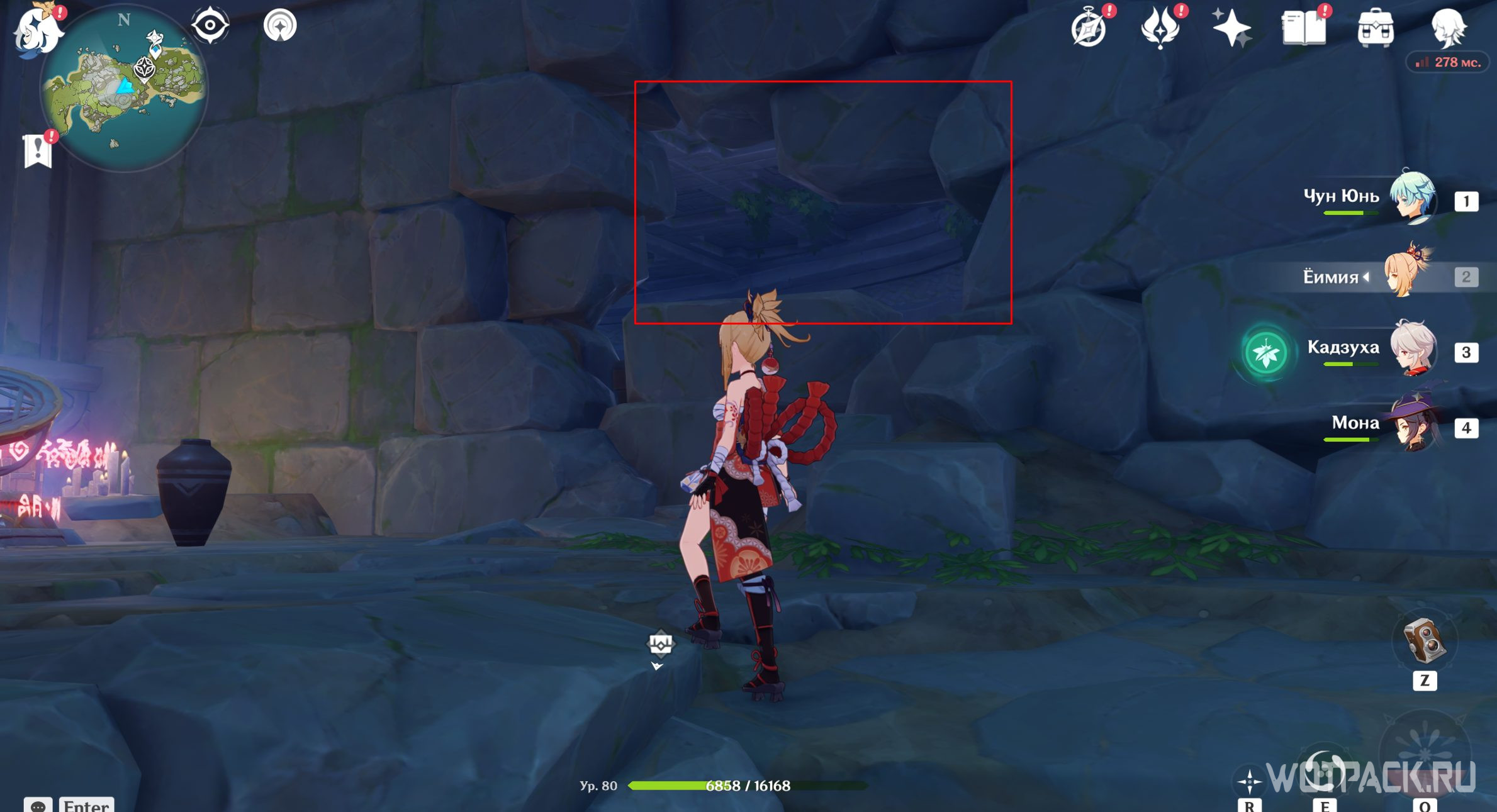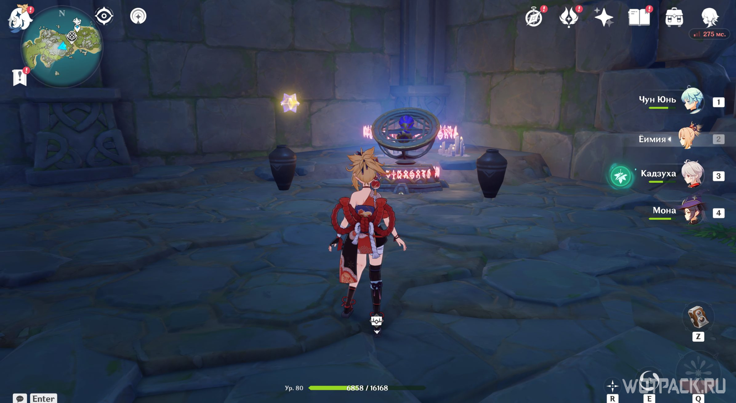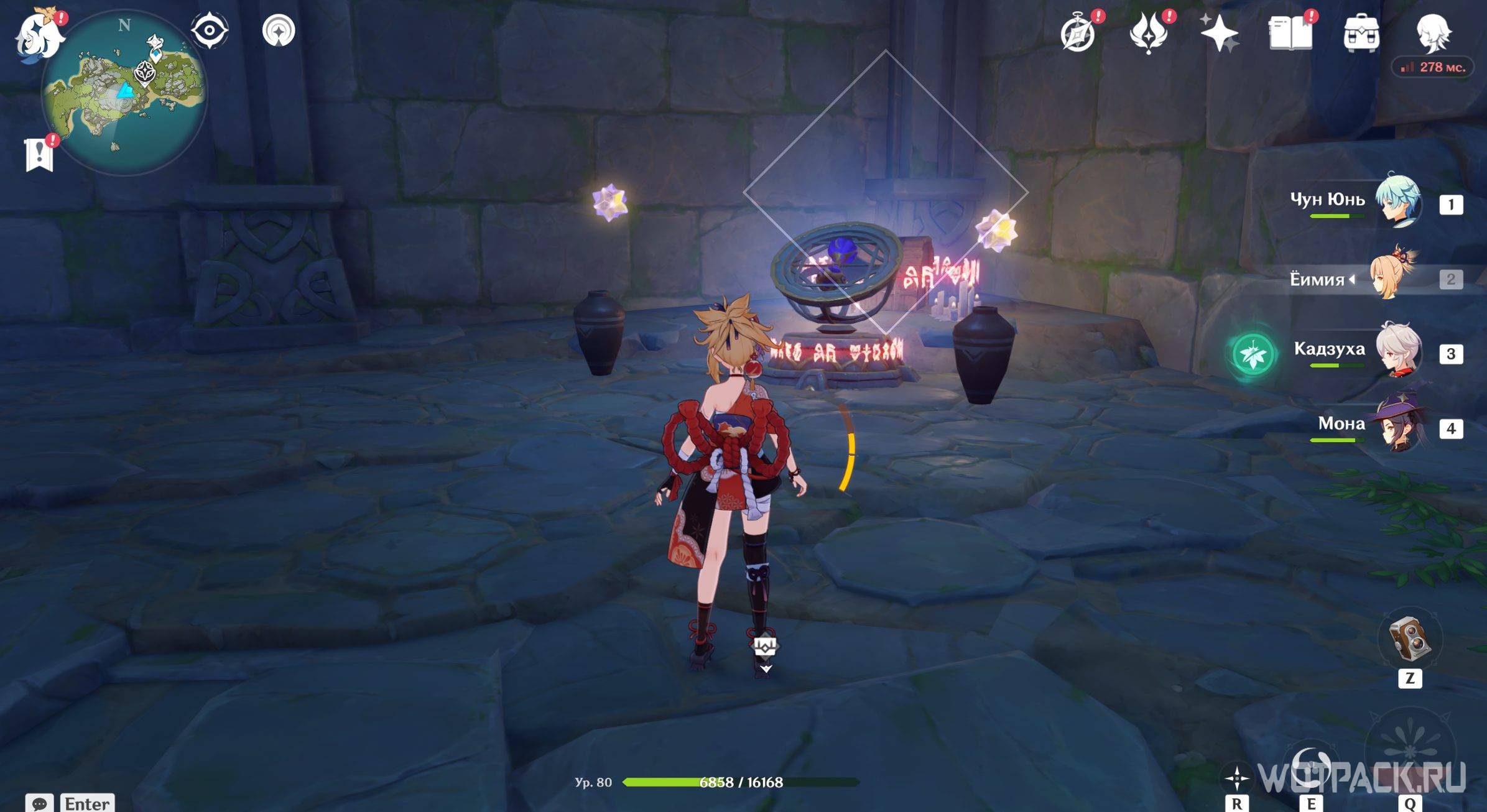 В дальнем правом углу тайной комнаты есть камни, которые можно и нужно уничтожить. Первая проблема устранена, теперь подойдите к каждому факелу и, пользуясь Анемо рассеиванием, очистите их от порчи.