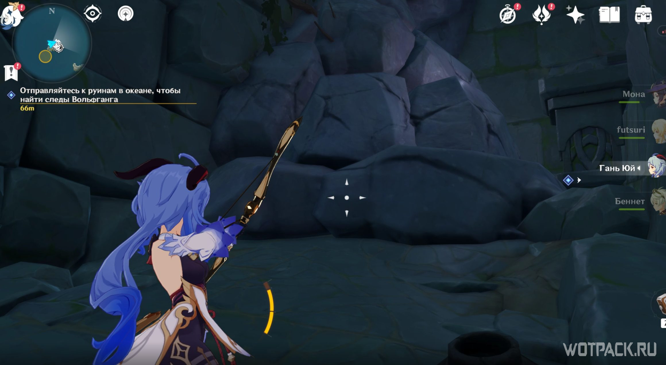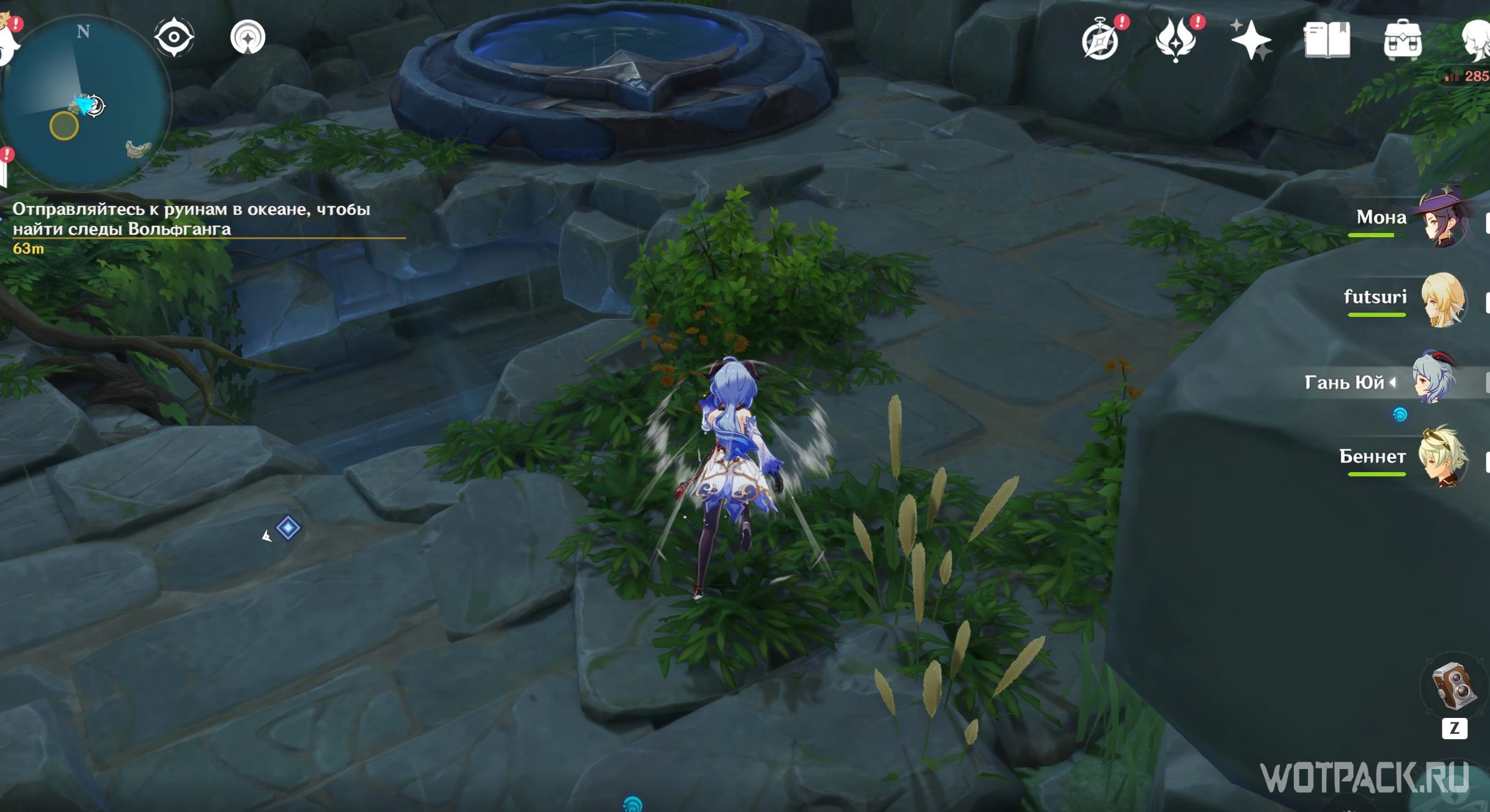 Вольфганг не имеет элементальных навыков, поэтому Путешественник и Паймон решают помочь ему иначе: найдите место, чтобы оставить подсказку. Выйдите из тайной комнаты и оставьте послание прямо перед входом. Выходите на улицу и измените вид руин на современный в том же пруду, у которого оказались при перемещении.