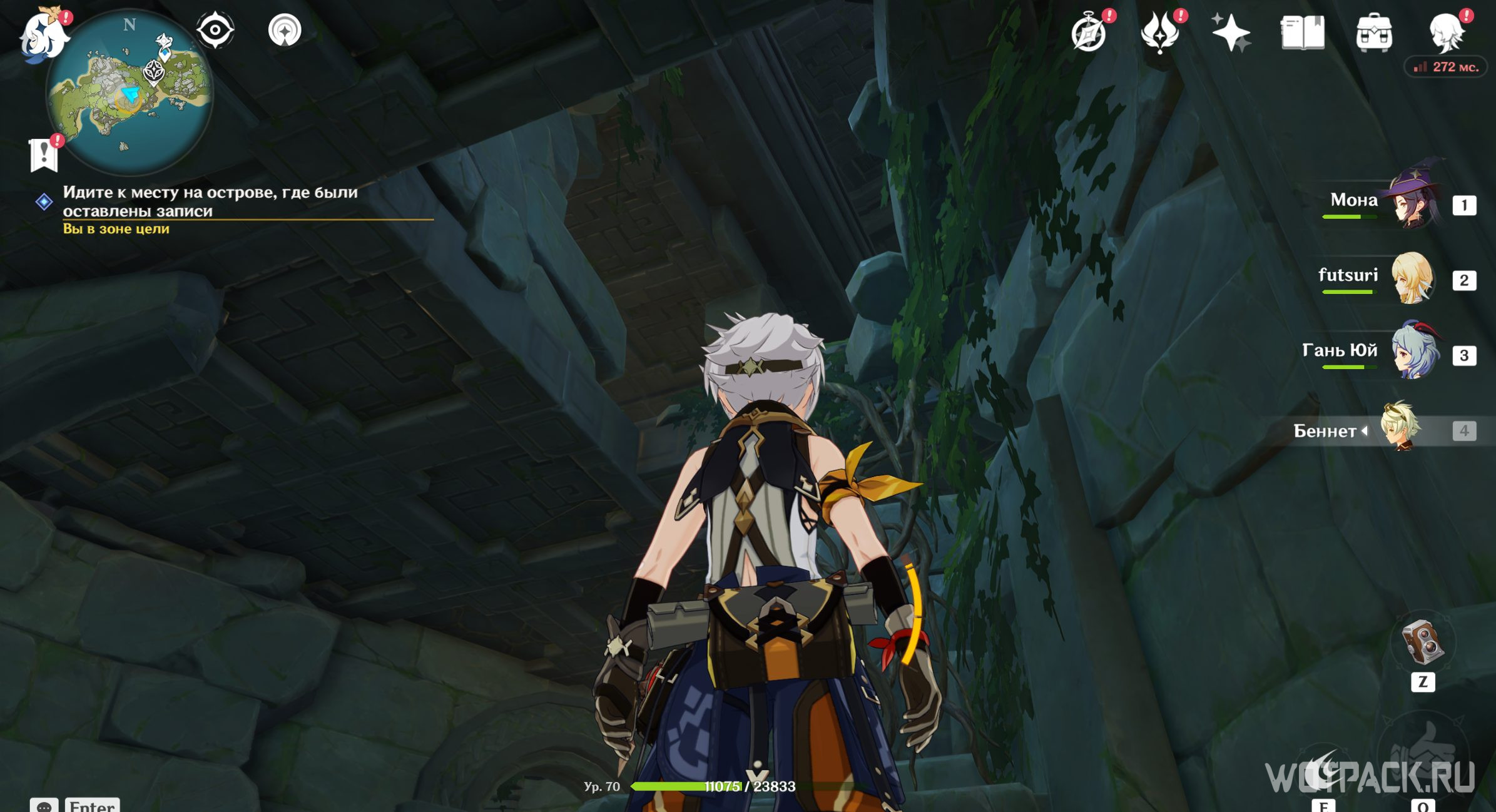Отправляйтесь на запад, к руинам. Доплыв до нужного островка, зайдите внутрь и спрыгните вниз. Оказавшись внутри руин, залезайте в отверстие в стене и сверните направо. Там стоят камни, которые необходимо сломать и зайти в потайной ход.