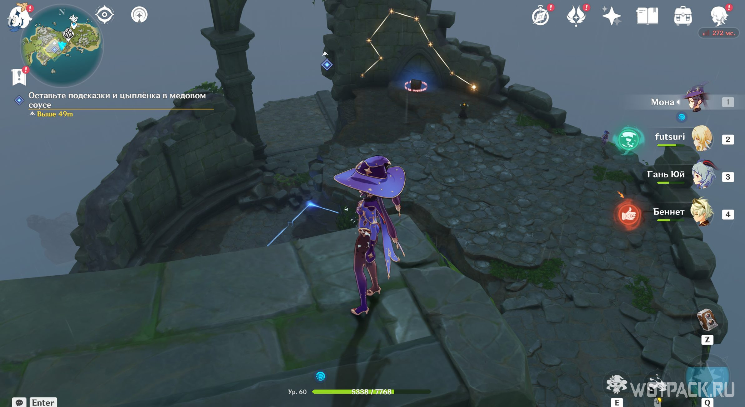 Начнется кат-сцена, где покажут, как звездная тропа появляется вокруг руин. По ней поднимайтесь до самого верха. После того как встанете на строение, заберите роскошный сундук и отправляйтесь к маркеру на обратной стороне колонны. Оставьте там послание и цыпленка в медовом соусе.