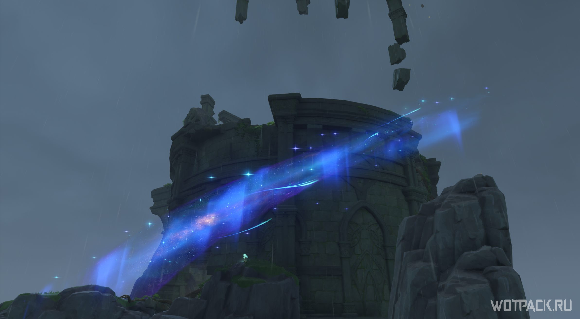 Для восхождения на самую вершину необходимо вставить в созвездие три Слияния звездного света. Два были забраны ранее из пещеры, третье из Драгоценного сундука. Расскажем, как получить еще одну звезду. Подойдите к краю платформы за спиной Моны. Заметно, что дождь падает на невидимую текстуру.