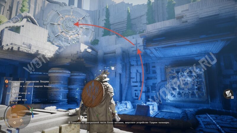 Взаимодействовав с ещё одной ТП, переместите парящее силовое ядро (тёмно-синий сгусток) к каменному изваянию справа с помощью Силы Аксиомы. Этим активируете источник света и избавитесь от стены, которая препятствует изучению нижнего яруса.