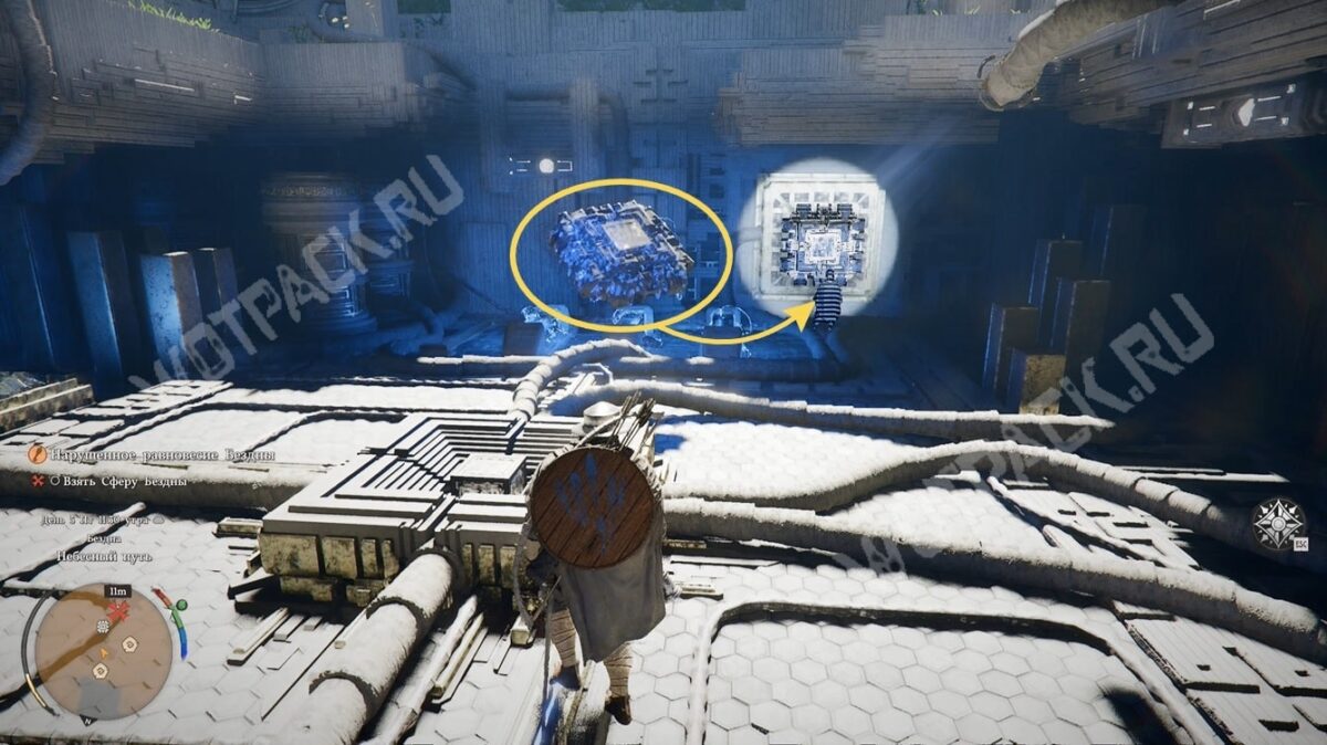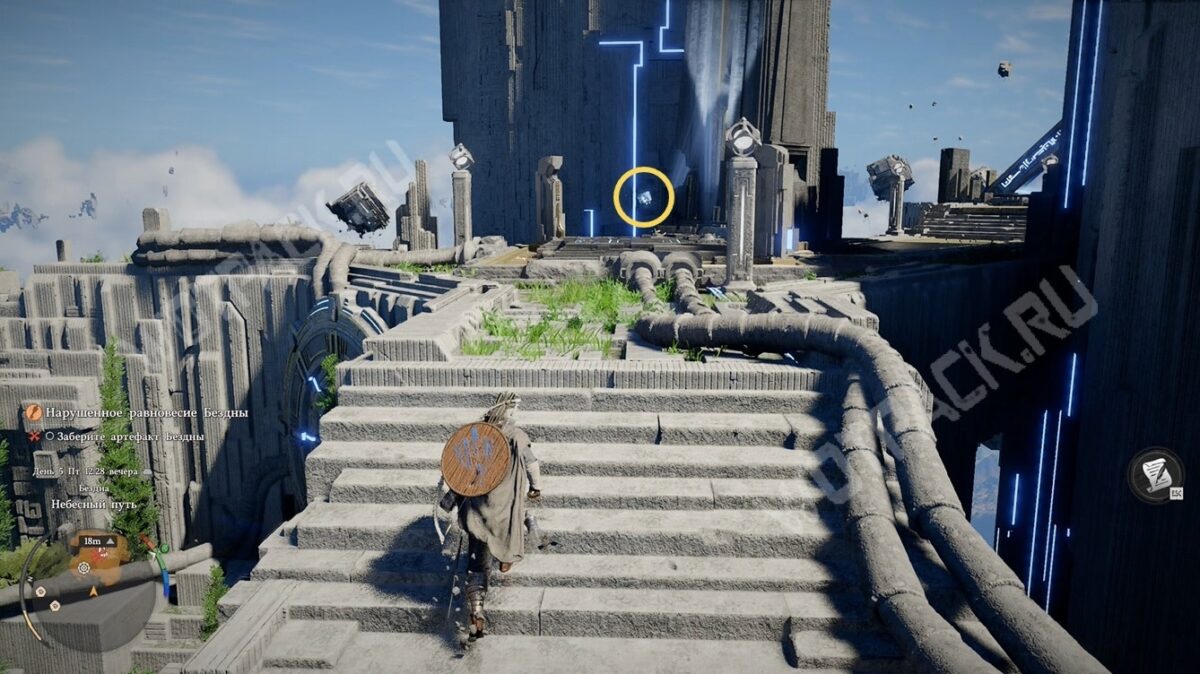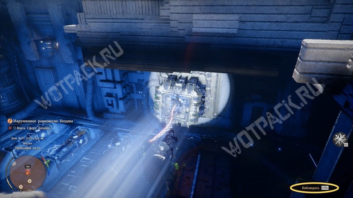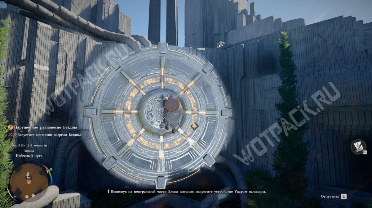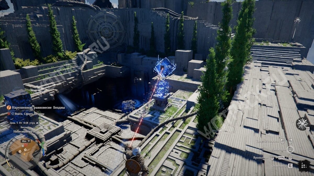 Взаимодействовав с ещё одной ТП, переместите парящее силовое ядро (тёмно-синий сгусток) к каменному изваянию справа с помощью Силы Аксиомы. Этим активируете источник света и избавитесь от стены, которая препятствует изучению нижнего яруса.