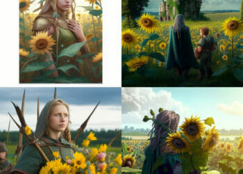 В качестве примера с нашей стороны главным объектом будущего арта является эльф, второстепенным — подсолнухи. Общий запрос звучит следующим образом: «Эльф собирает подсолнухи на лугу». На английском: «Elf harvest sunflowers in a meadow».
