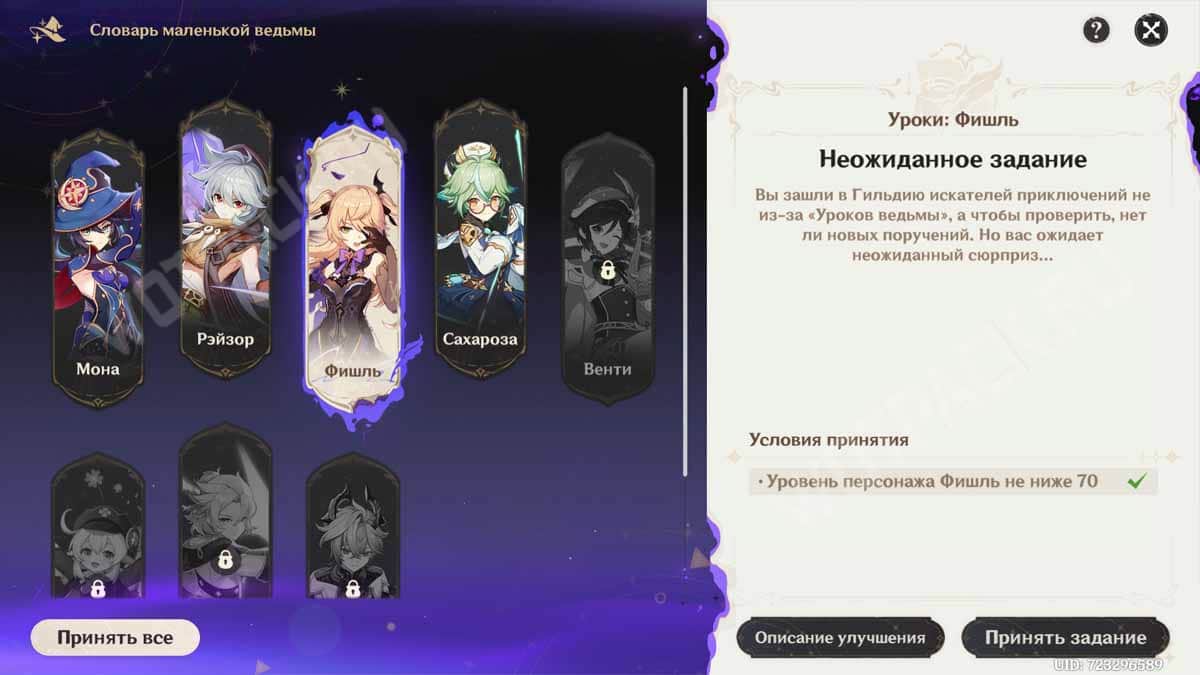 «Уроки Фишль: Неожиданное задание» открывают усиление принцессы осуждения резонансом Шабаша. Новые способности героини раскроются при взаимодействии с другими компаньонами из фракции. Все руководства по прохождению личных квестов и баффы навыков персонажей указаны в общей статье.