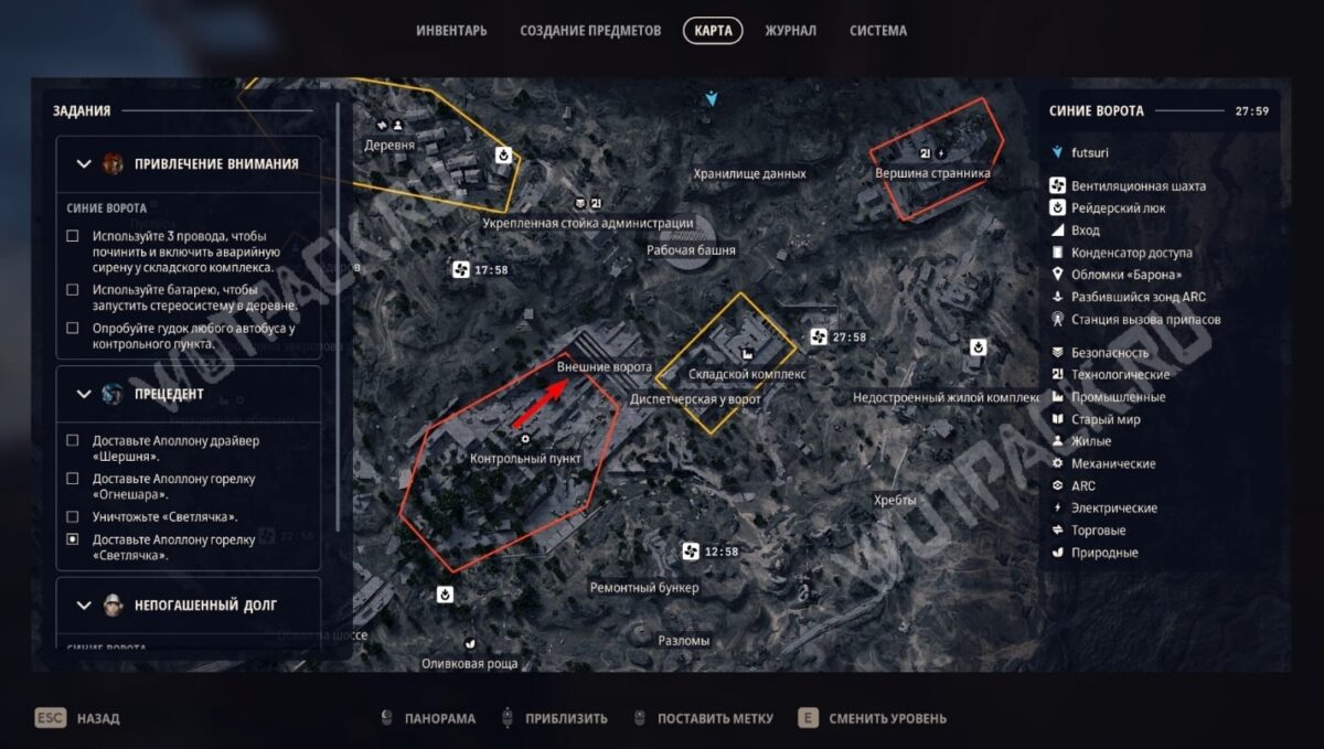 Выйдя из шахты зиплайна, поверните направо. Между двумя красными генераторами лежит сумка рейдера. Осмотрев её, подберите с земли заметку и положите её в потайной карман. Останется завершить вылазку и доставить Тянь Вэнь записку Плута.