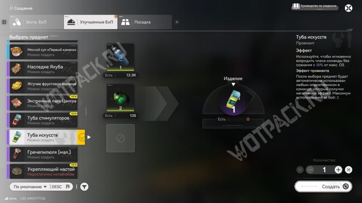 - Если во время драки постоянно погибает основной дамагер группы, попробуйте вместо гречекапсул поставить в слот провианта тубу искусств. Этот предмет дважды за бой может воскресить павшего персонажа с 30% ХП. Делается из светожуков и ферриевых бутылок.