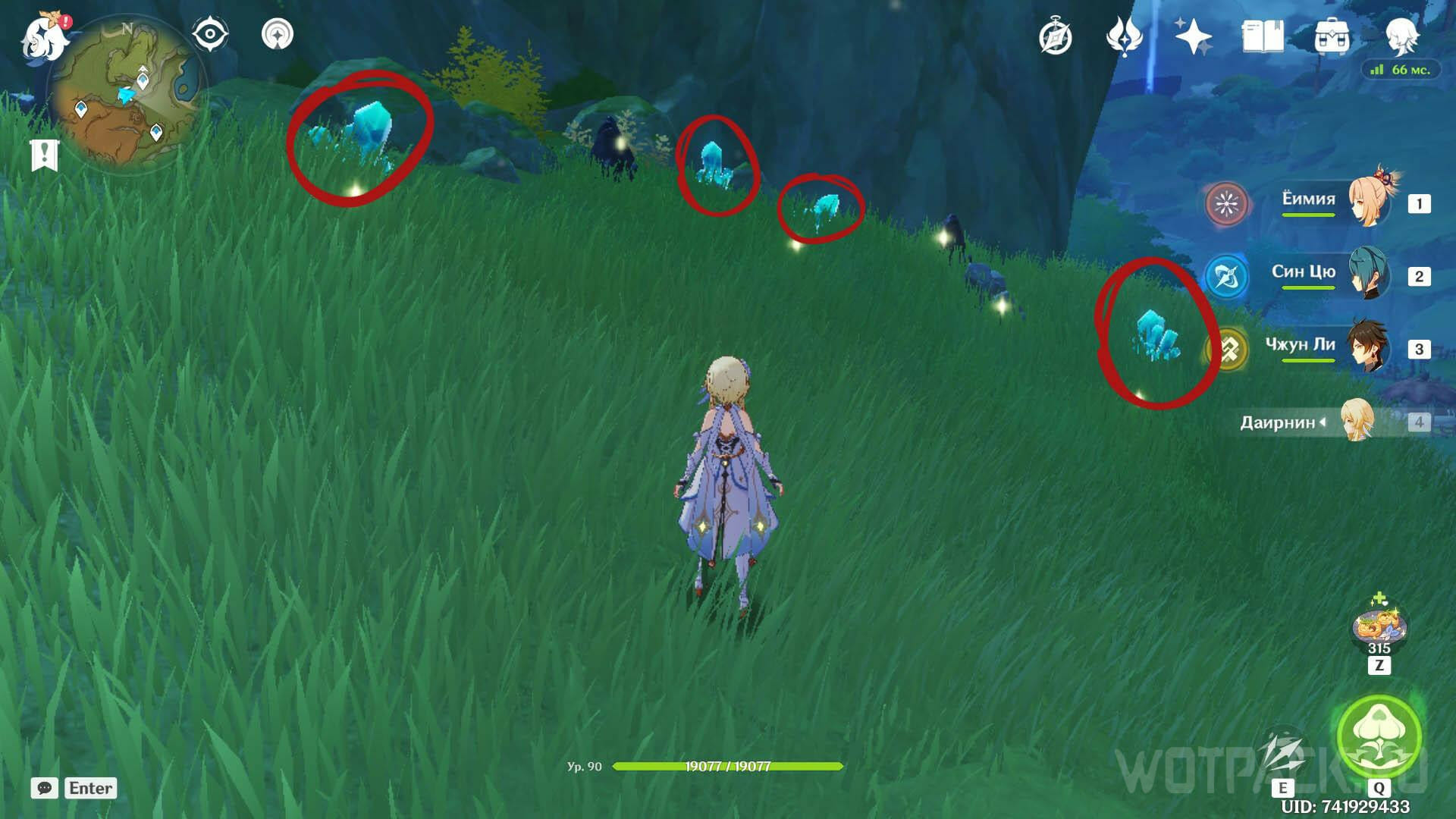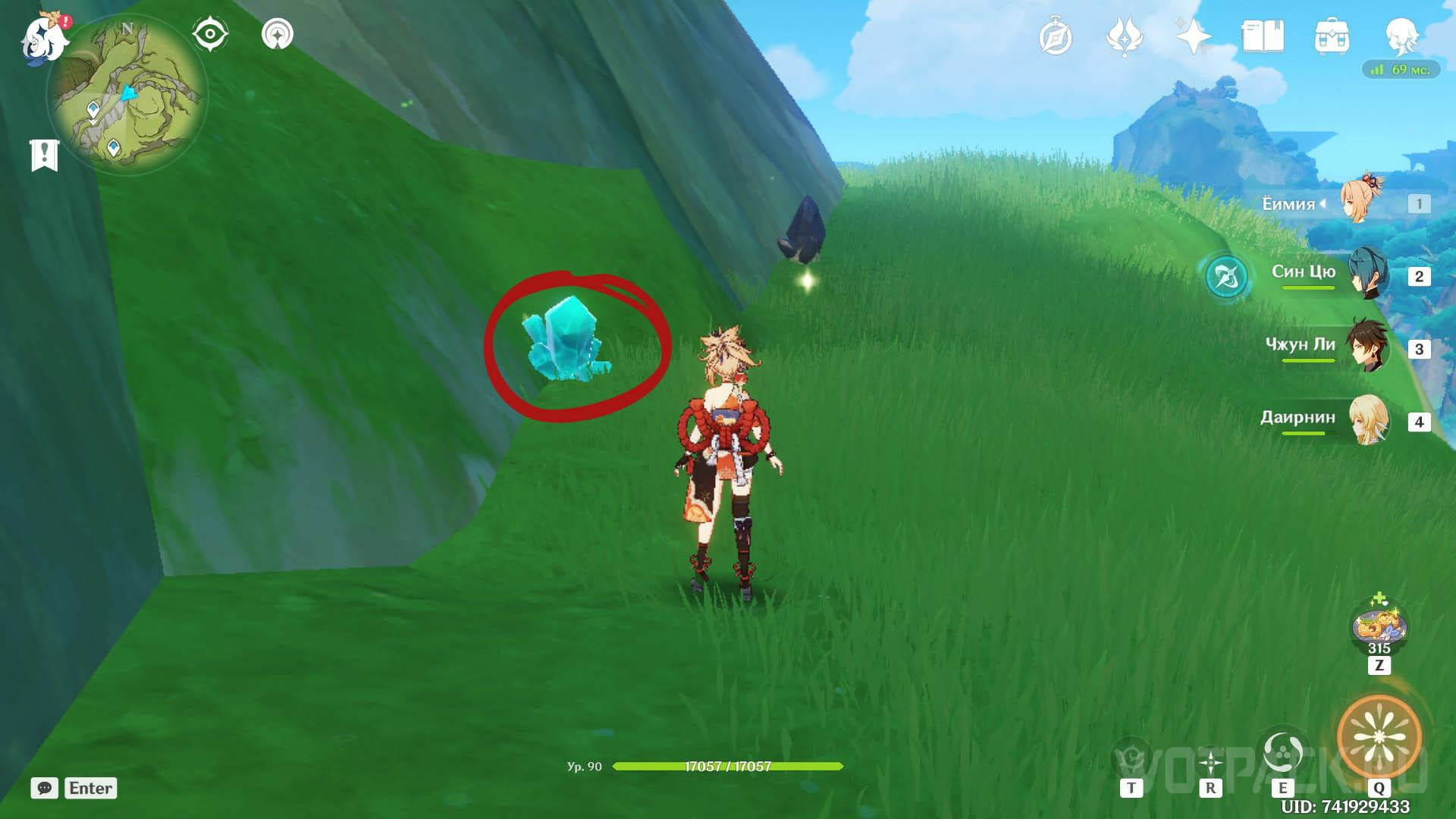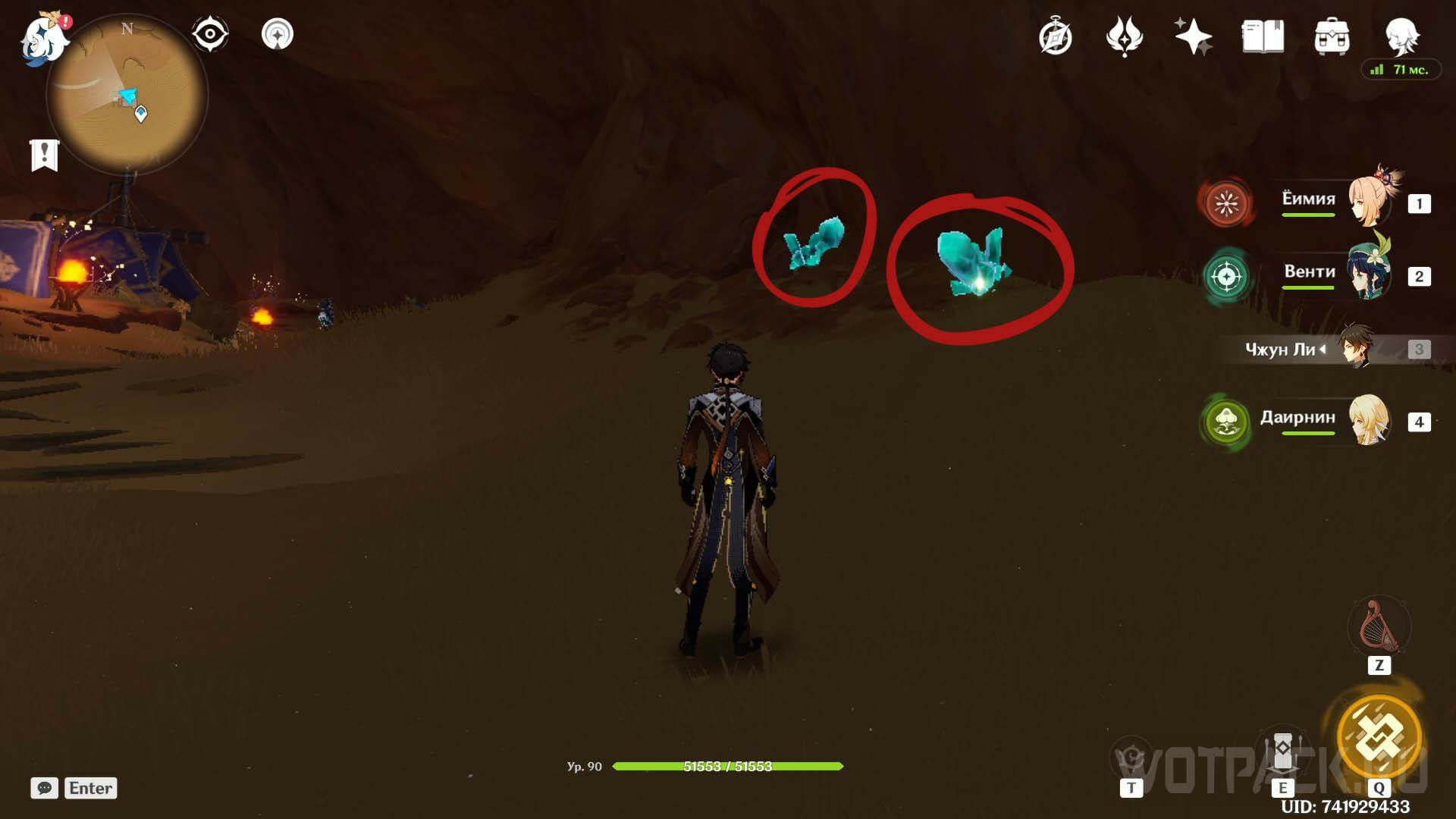 Начать фарм можно рядом со склоном Уван, где находится парочка кристаллов. Однако стоит быть осторожнее, так как поблизости расположен лагерь Похитителей сокровищ.
