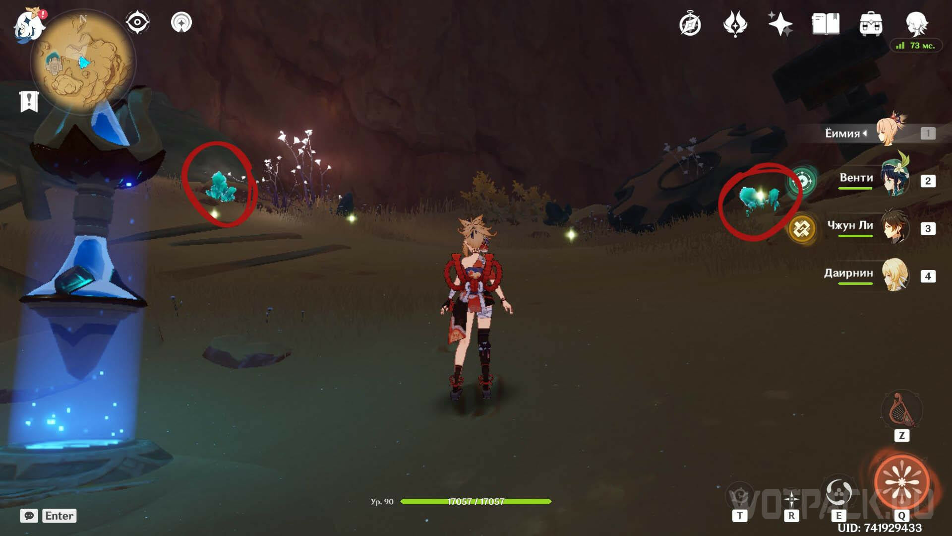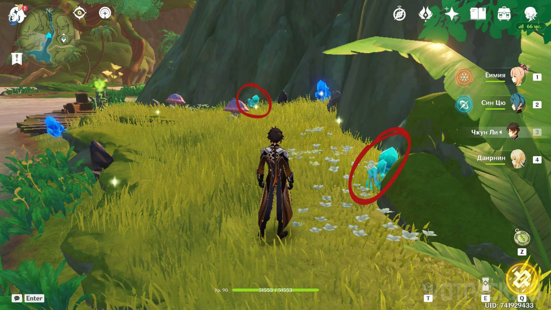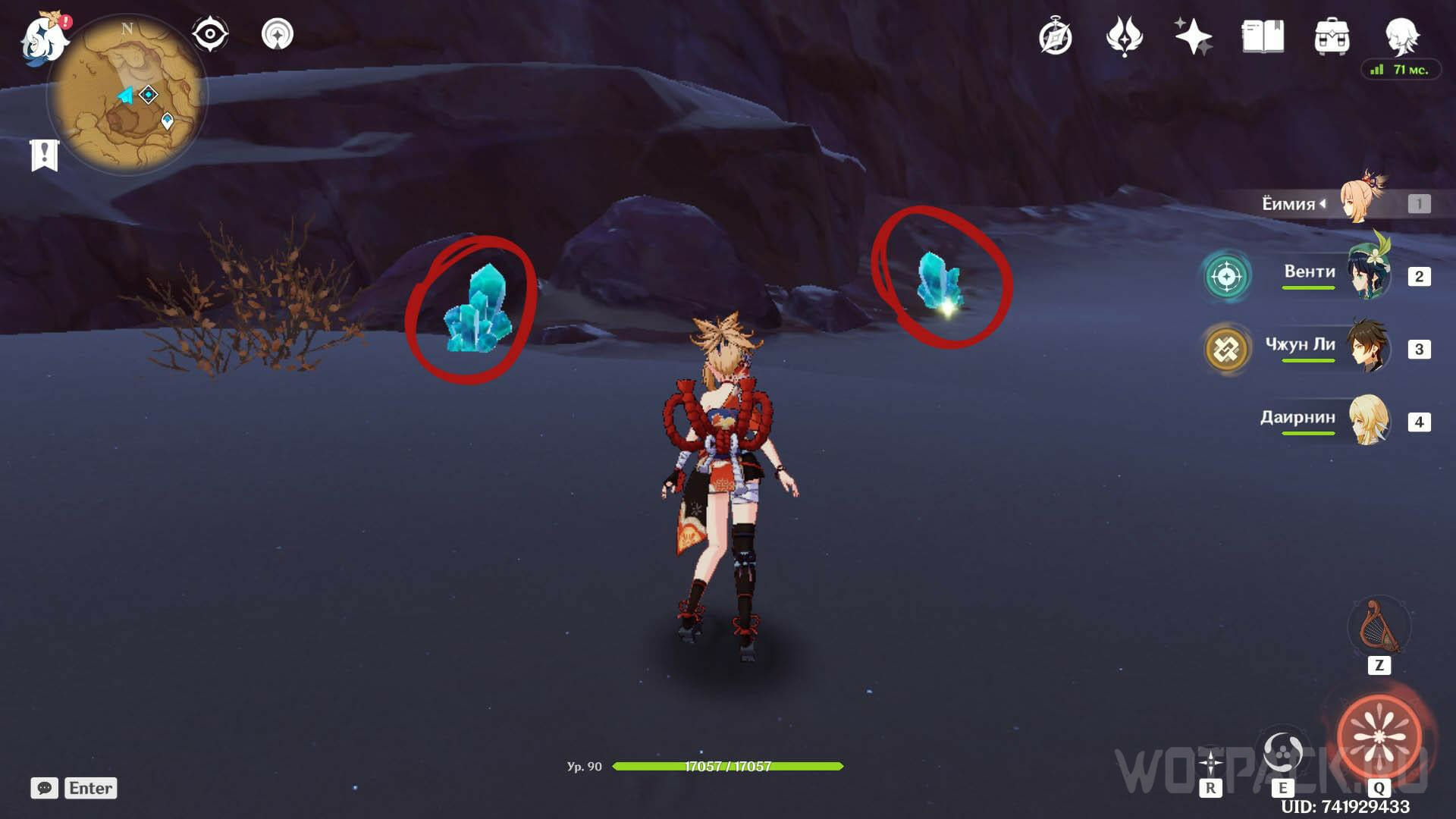Начать фарм можно рядом со склоном Уван, где находится парочка кристаллов. Однако стоит быть осторожнее, так как поблизости расположен лагерь Похитителей сокровищ.