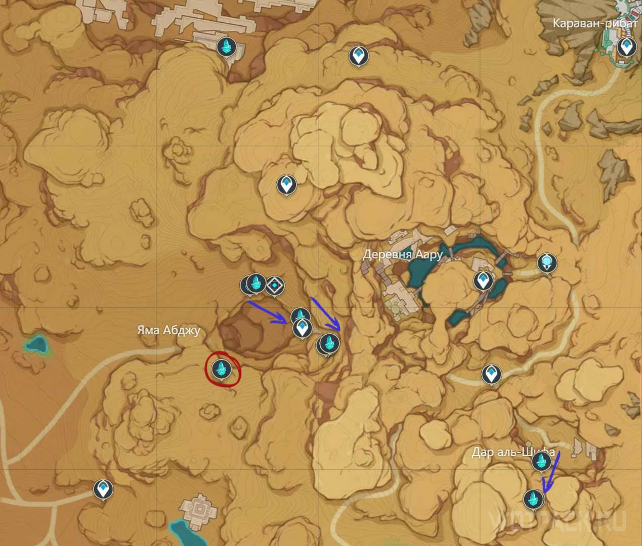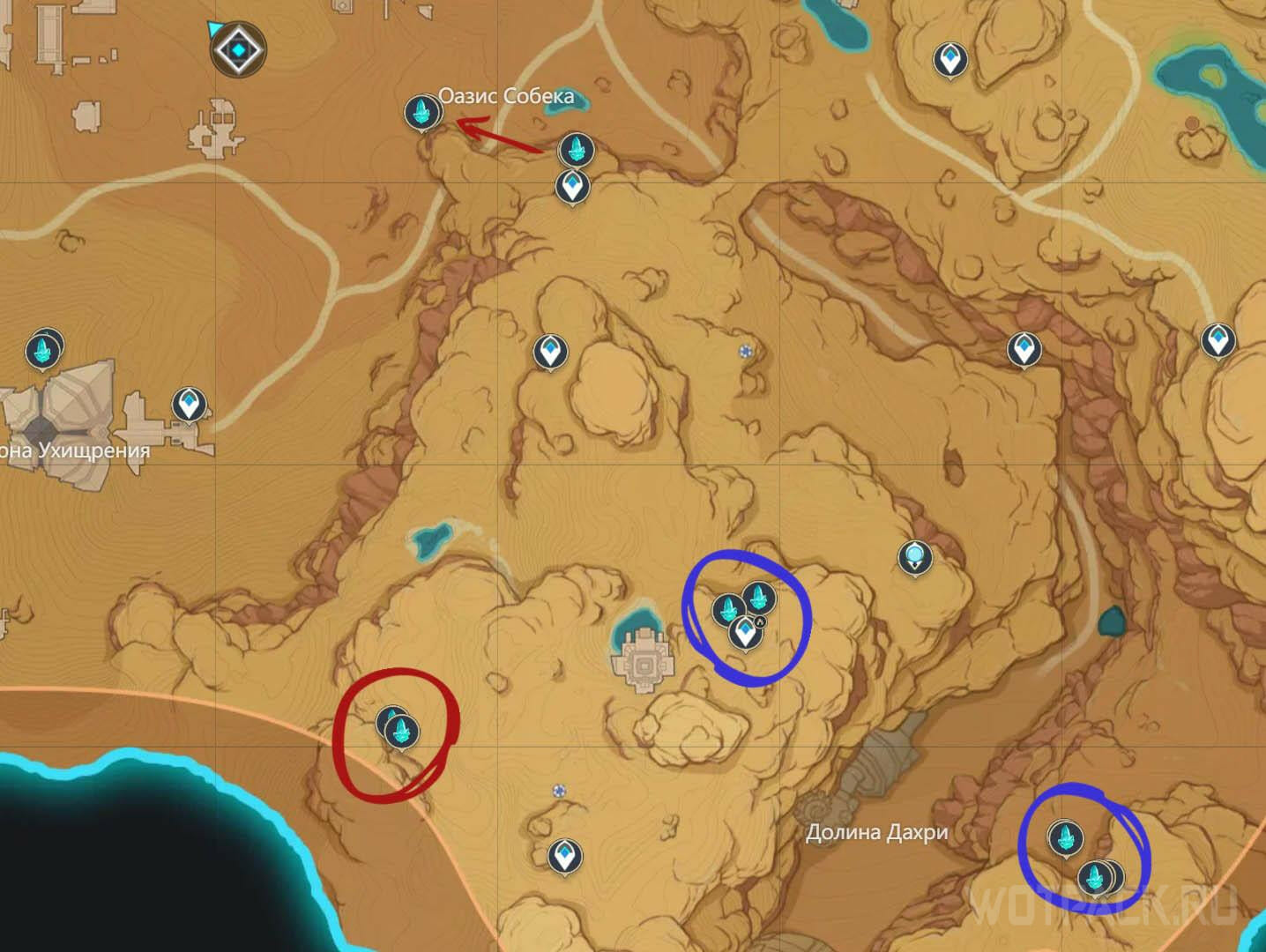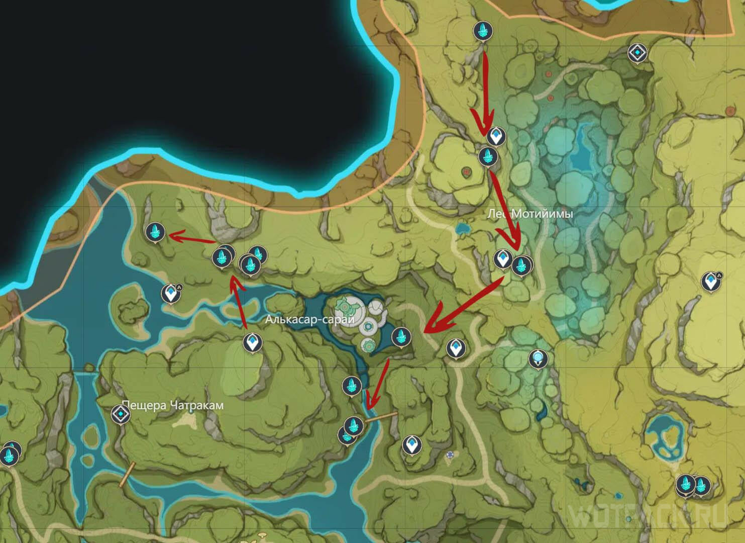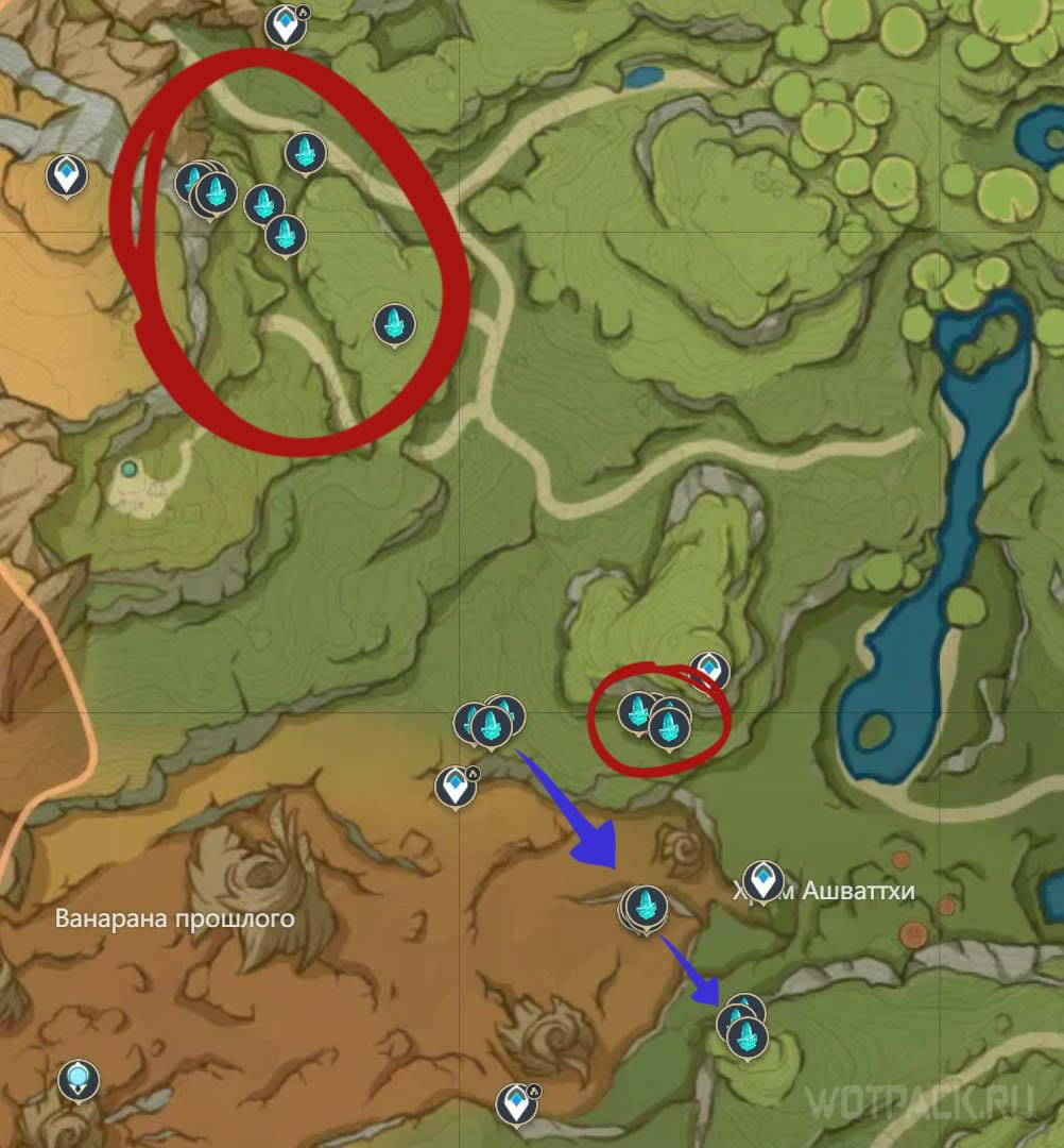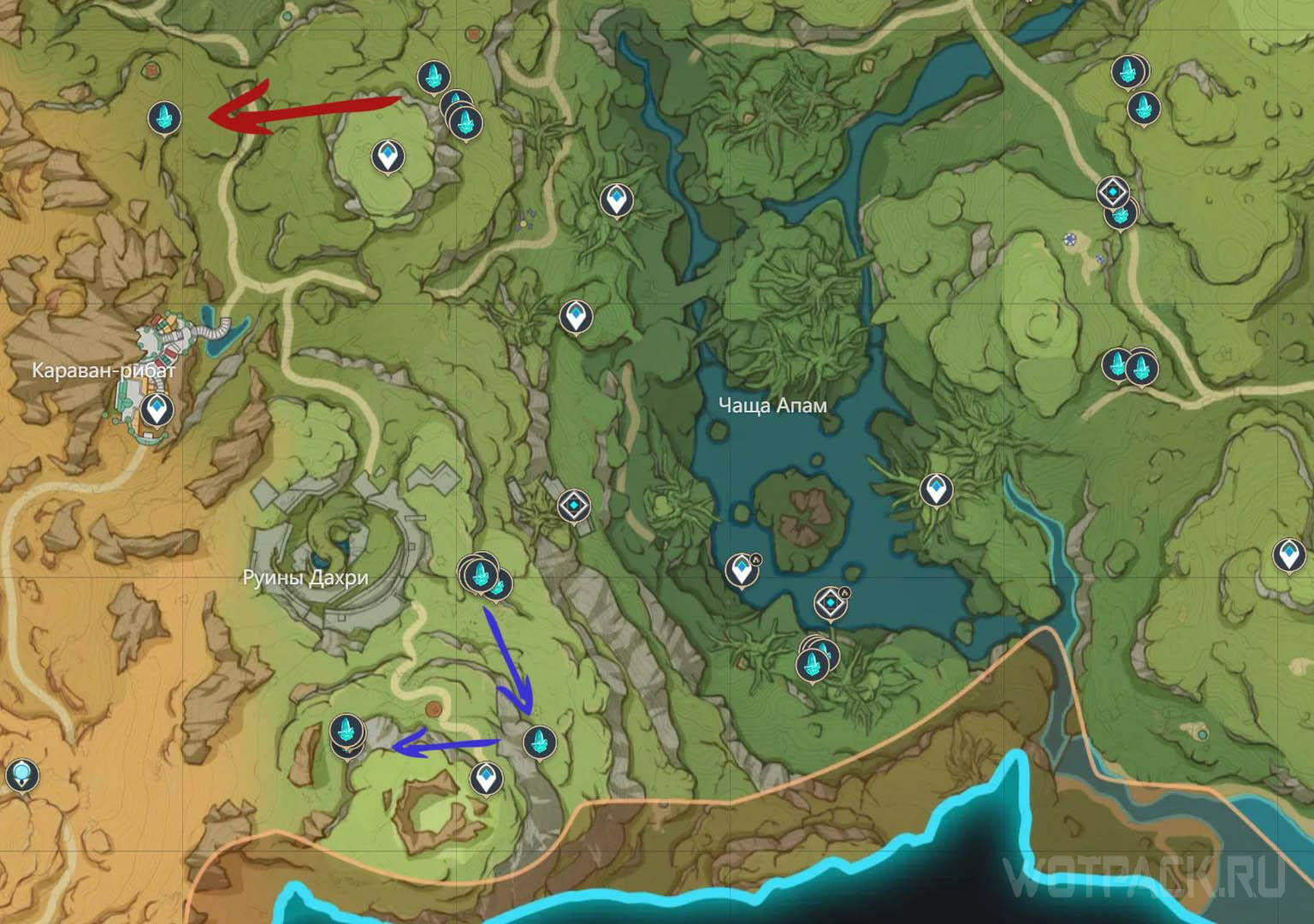 - От статуи Архонта на западной стороне области пройдите на север, в сторону деревни Гандхарва. Этот путь принесет не менее 8 кусков кристалла.