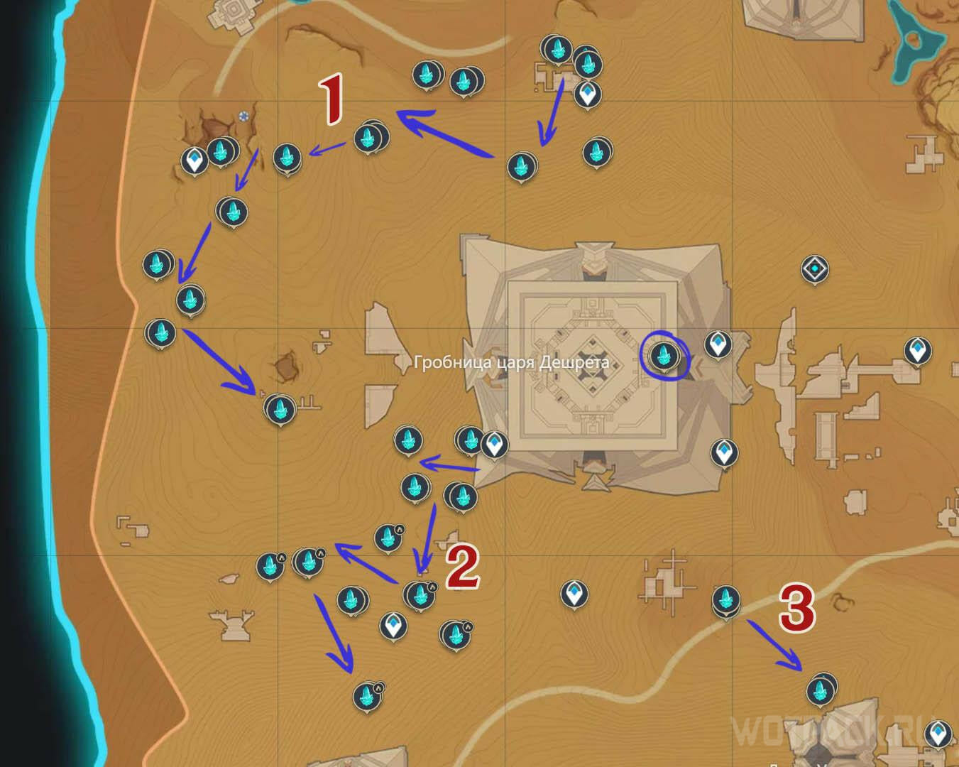 - Самый длинный, простирающийся от прозрачных руин на севере и соответствующего подземного телепорта до провалов к западу от гробницы Дешрета. Всего на этом маршруте можно добыть как минимум 30 единиц кристалла.