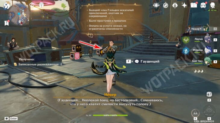 При наличии на аккаунте рассказчицы Нефер, во время взаимодействия с Катериной из Гильдии искателей приключений появится особая функция — обмен информацией. Чтобы открыть раздел скрытых заданий, включите в отряд героиню и поговорите с секретарем организации. Без участия персонажа из Куратория тайн диалог прервется.
