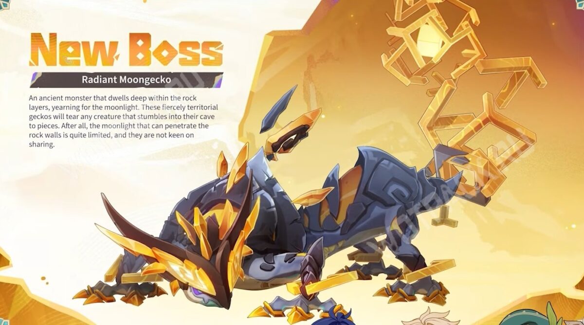 Лучезарный лунный геккон — ящер из пещеры, желающий получить серебряные отблески луны. За долгие годы обитания в тёмном закрытом пространстве его тело наполнилось особой силой, дающей 70% резиста к Гео стихии. Во время сражения существо забирается на каменный росток и замирает там. Чтобы парализовать врага, за короткий промежуток времени разрушьте шкалу тяжелыми атаками, скиллами с признаком Гео или другими методами.