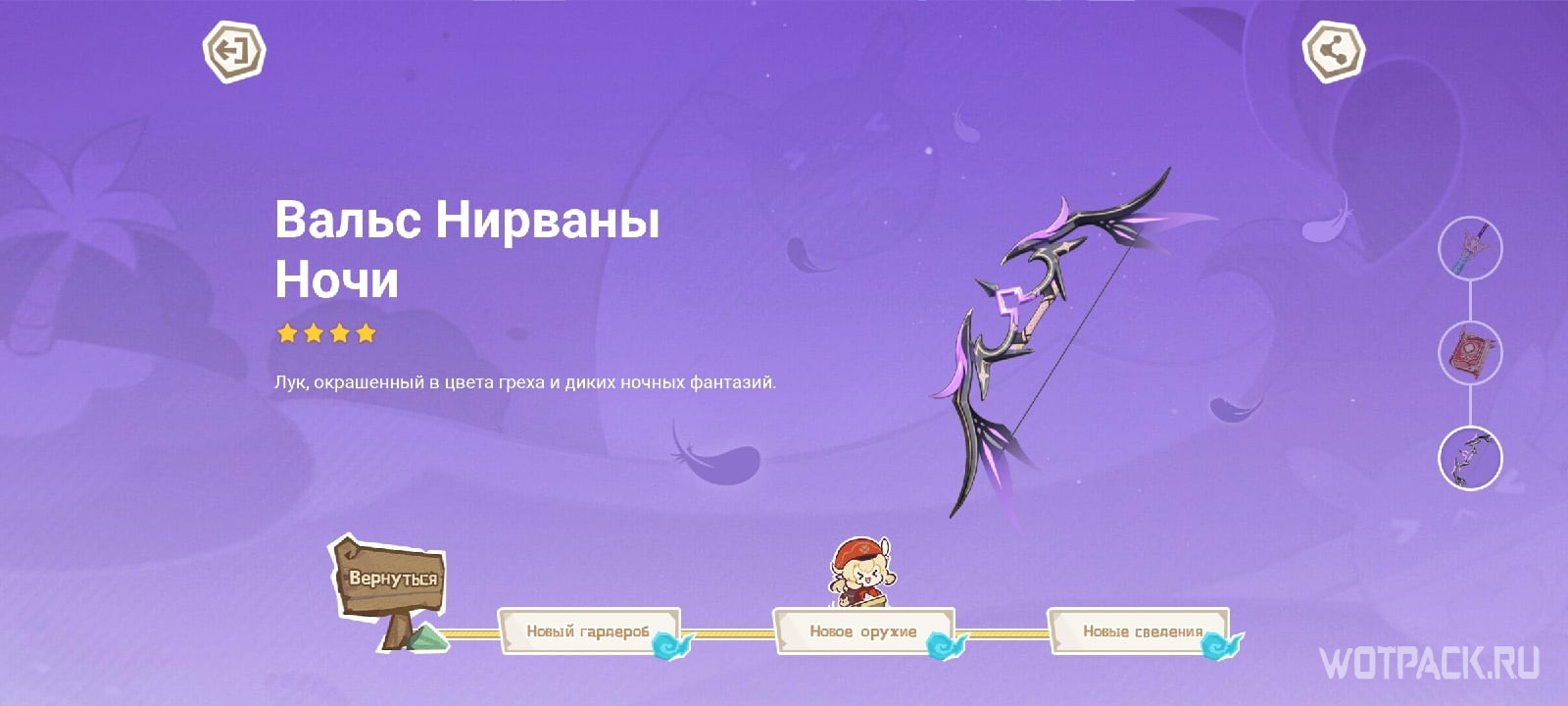 | 3 | ![]() Вальс Нирваны Ночи | ⭐️⭐️⭐️⭐️ | Базовый урон: | Дуэт полярной ночи Попадание обычной атакой дает +20% к урону элементального навыка на 5 секунд, а попадание Е-шкой, в свою очередь, делает обычные атаки сильнее на 20% в течение 5 секунд. |