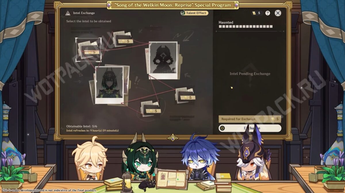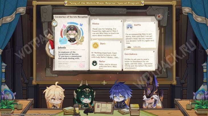 Ещё в них появятся мечник Дайнслейф, «Слуга» Арлекино в своей форме босса, дракон Дурин, алхимик Альбедо и продолжится противостояние с грешником Рери, охотящемуся за Коломбиной.