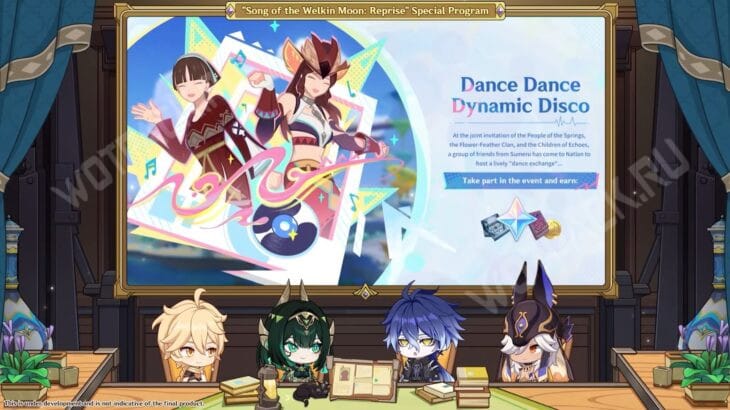Музыкальное мероприятие на территории поселения Народа Родников в Натлане. Состязайтесь с другими игроками в захватывающих баттлах и повторяйте движения профессиональных танцоров, чтобы заработать больше очков, чем оппонент.