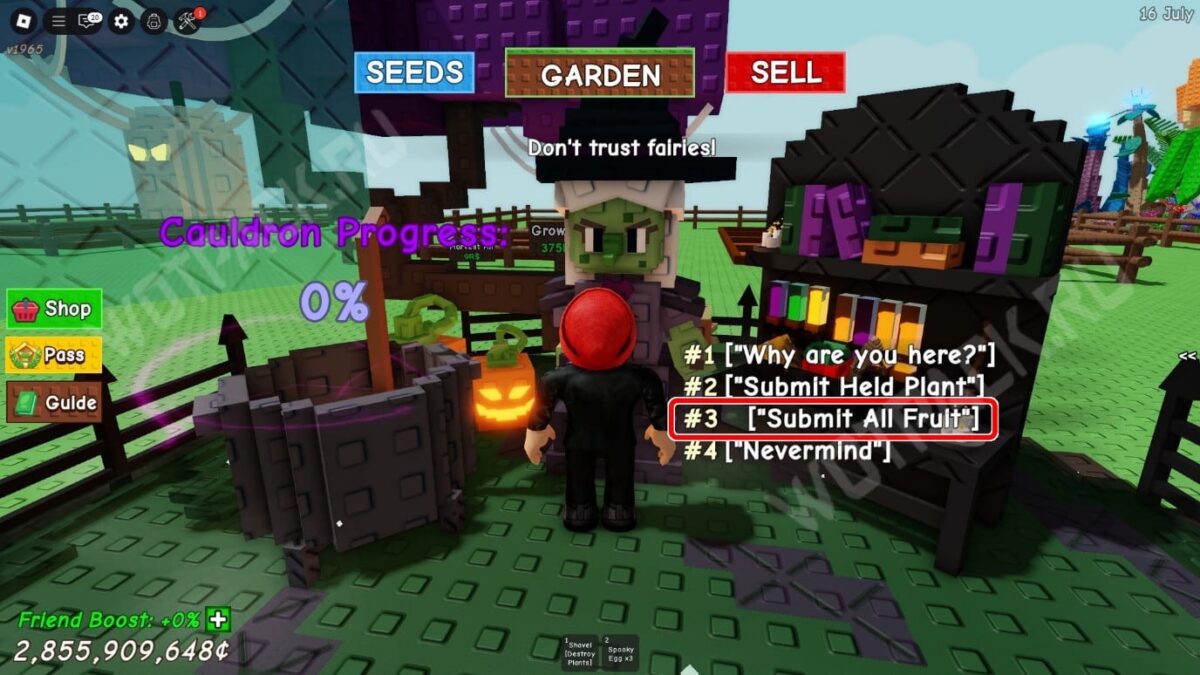 Каждый игрок может внести свой вклад в заполнение ведьминого котла. Отдавайте любые плоды со своего огорода до тех пор, пока процент заполнения не достигнет 100. Чтобы поместить все собранные плоды в котёл, поговорите с ведьмой и выберите третью реплику «Submit all fruit».
